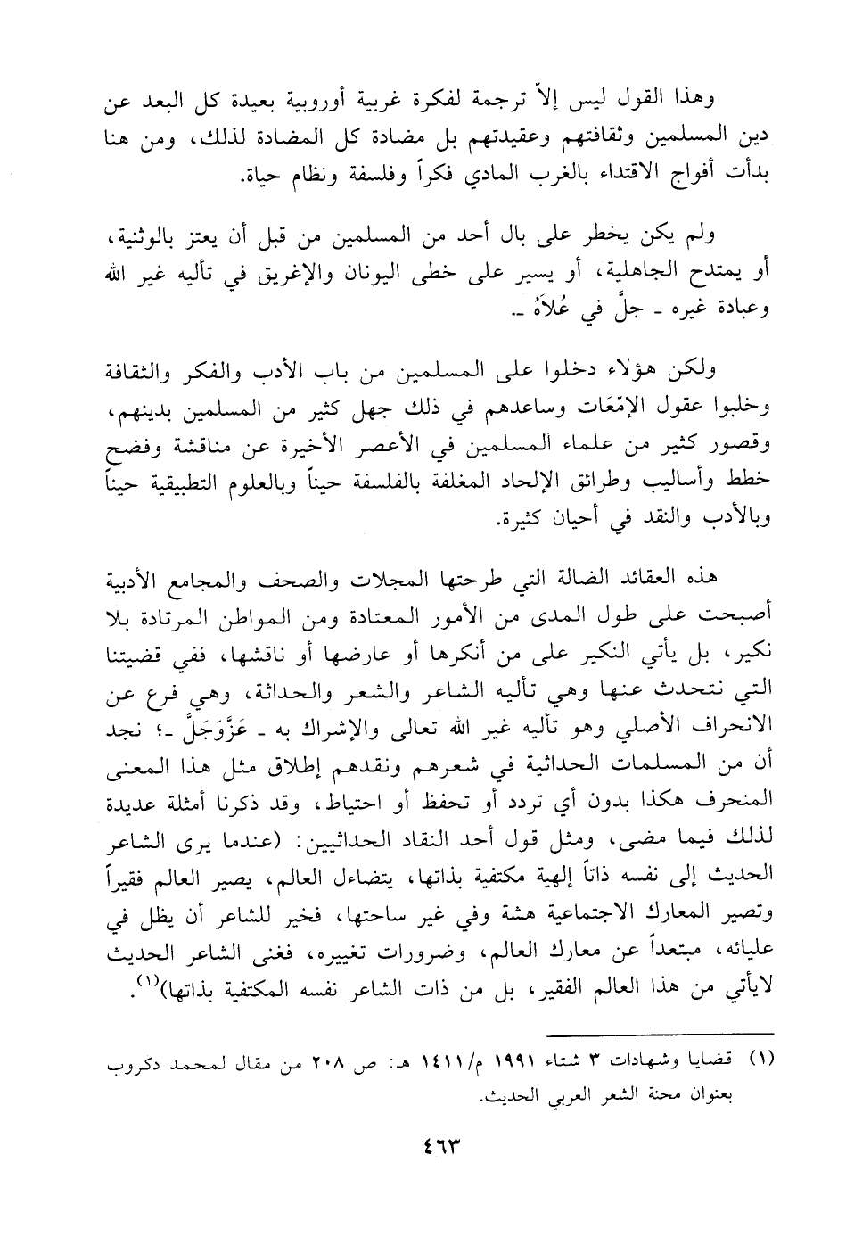 (¬١) قضايا وشهادات ٣ شتاء ١٩٩١ م/ ١٤١١ هـ: ص ٢٠٨ من مقال لمحمد دكروب بعنوان محنة الشعر العربي الحديث.