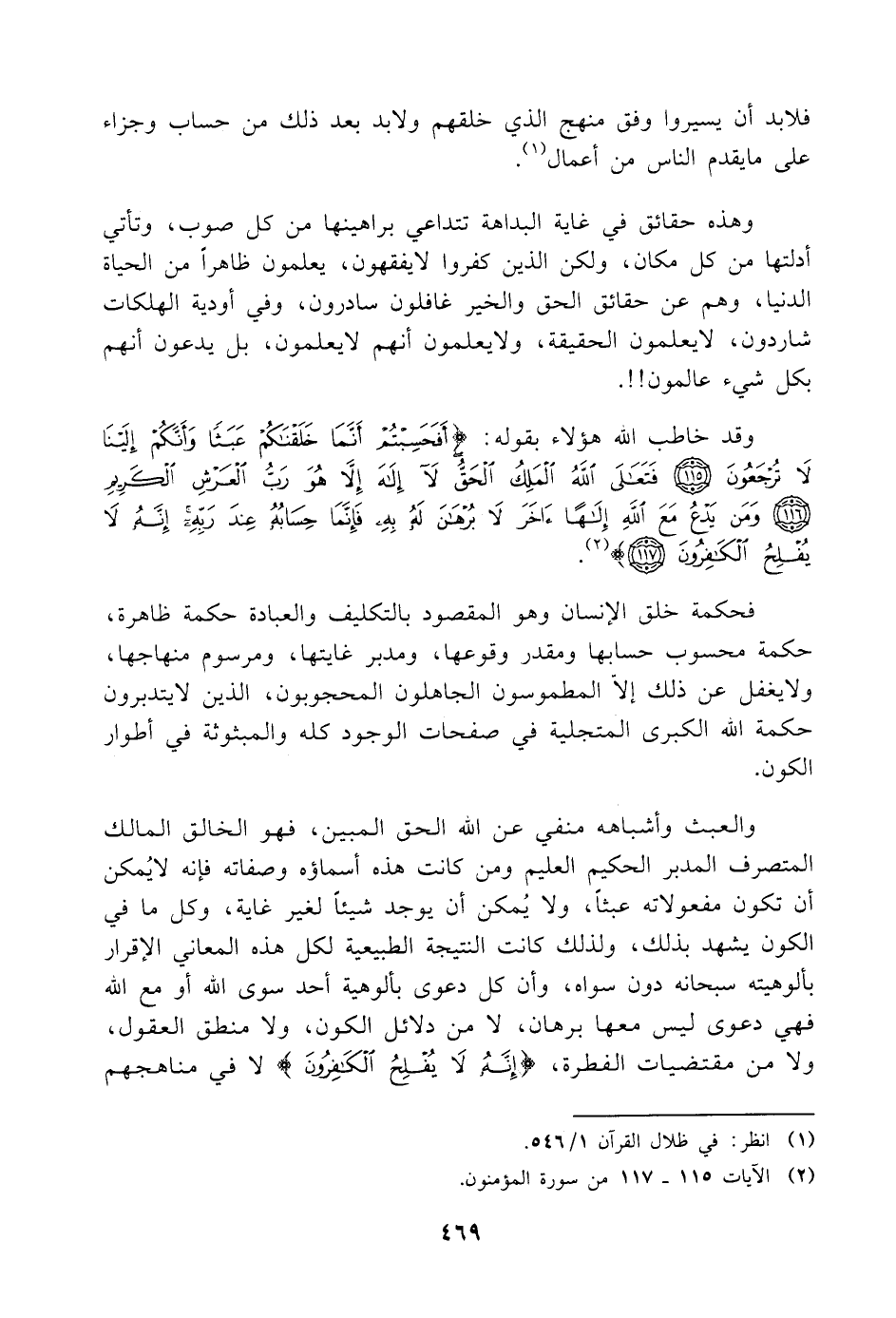 والعبث وأشباهه منفي عن اللَّه الحق المبين، فهو الخالق المالك المتصرف المدبر الحكيم العليم ومن كانت هذه أسماؤه وصفاته فإنه لا يُمكن أن تكون مفعولاته عبثًا، ولا يُمكن أن يوجد شيئًا لغير غاية، وكل ما في الكون يشهد بذلك، ولذلك كانت النتيجة الطبيعية لكل هذه المعاني الإقرار بألوهيته سبحانه دون سواه، وأن كل دعوى بألوهية أحد سوى اللَّه أو مع اللَّه فهي دعوى ليس معها برهان، لا من دلائل الكون، ولا منطق العقول، ولا من مقتضيات الفطرة، {إِنَّهُ لَا يُفْلِحُ الْكَافِرُونَ} لا في مناهجهم