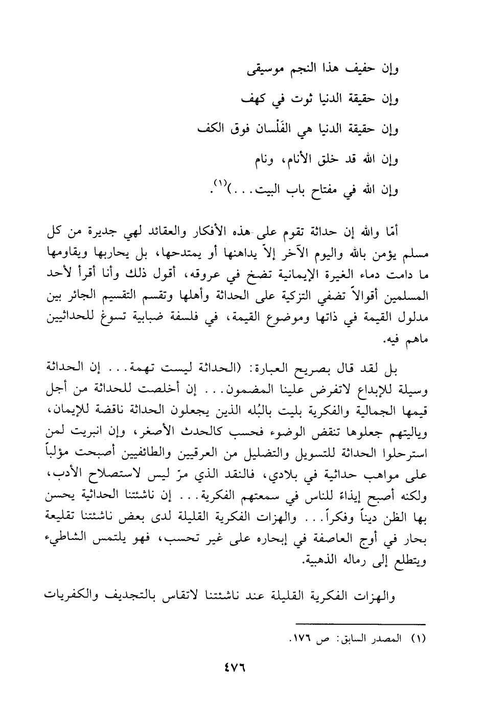 أمّا واللَّه إن حداثة تقوم على هذه الأفكار والعقائد لهي جديرة من كل مسلم يؤمن باللَّه واليوم الآخر إلّا يداهنها أو يمتدحها، بل يحاربها ويقاومها ما دامت دماء الغيرة الإيمانية تضخ في عروقه، أقول ذلك وأنا أقرأ لأحد المسلمين أقوالًا تضفي التزكية على الحداثة وأهلها وتقسم التقسيم الجائر بين مدلول القيمة في ذاتها وموضوع القيمة، في فلسفة ضبابية تسوغ للحداثيين ما هم فيه.