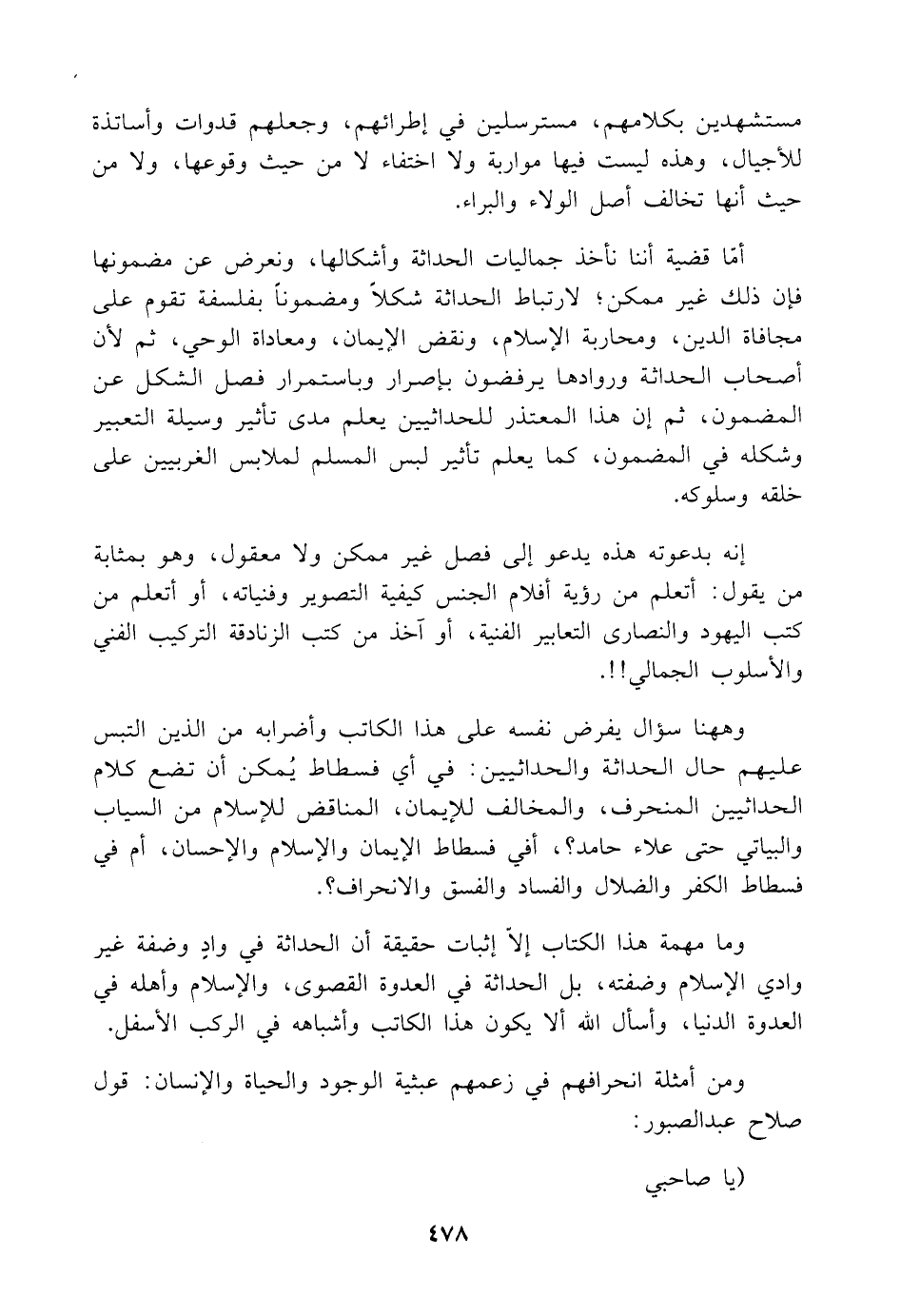 وما مهمة هذا الكتاب إلّا إثبات حقيقة أن الحداثة في واد وضفة غير وادي الإسلام وضفته، بل الحداثة في العدوة القصوى، والإسلام وأهله في العدوة الدنيا، وأسأل اللَّه ألا يكون هذا الكاتب وأشباهه في الركب الأسفل.
