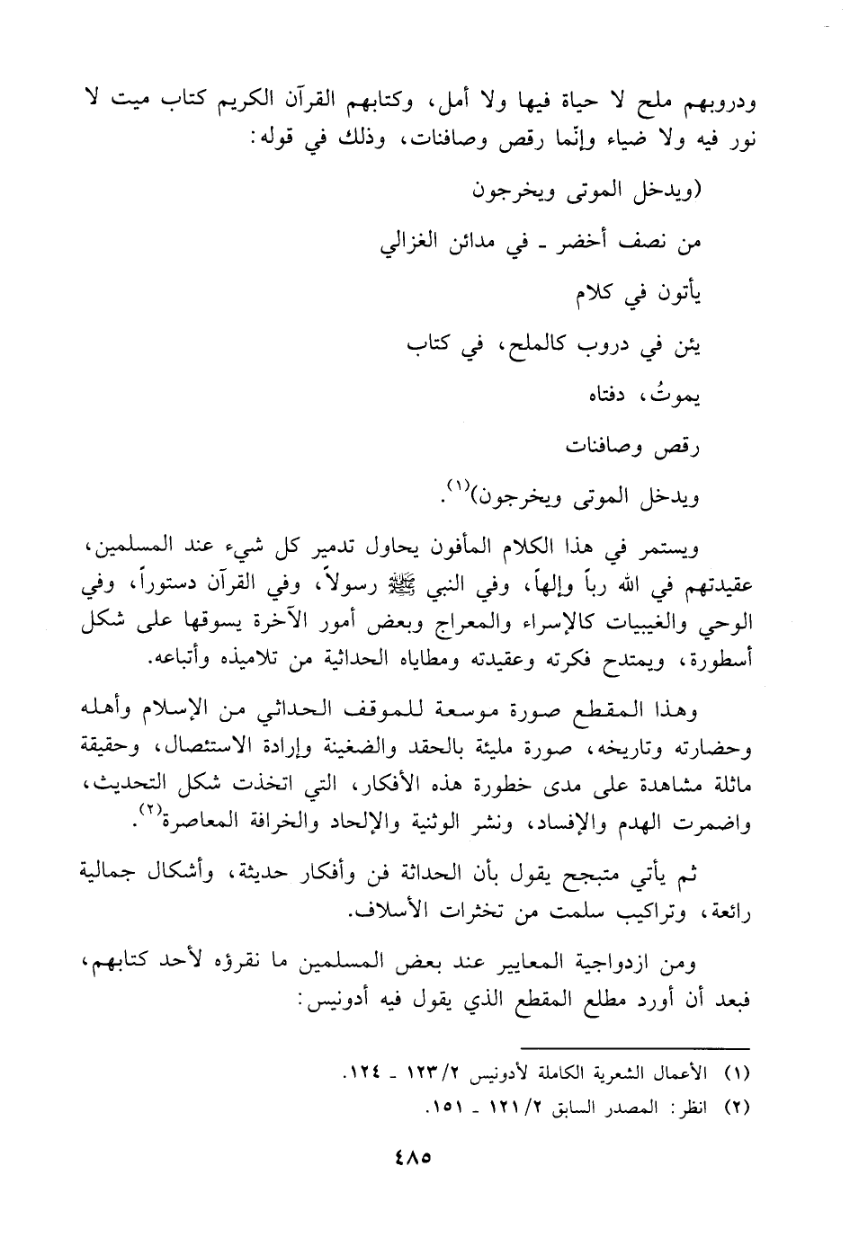 ومن ازدواجية المعايير عند بعض المسلمين ما نقرؤه لأحد كتابهم، فبعد أن أورد مطلع المقطع الذي يقول فيه أدونيس: