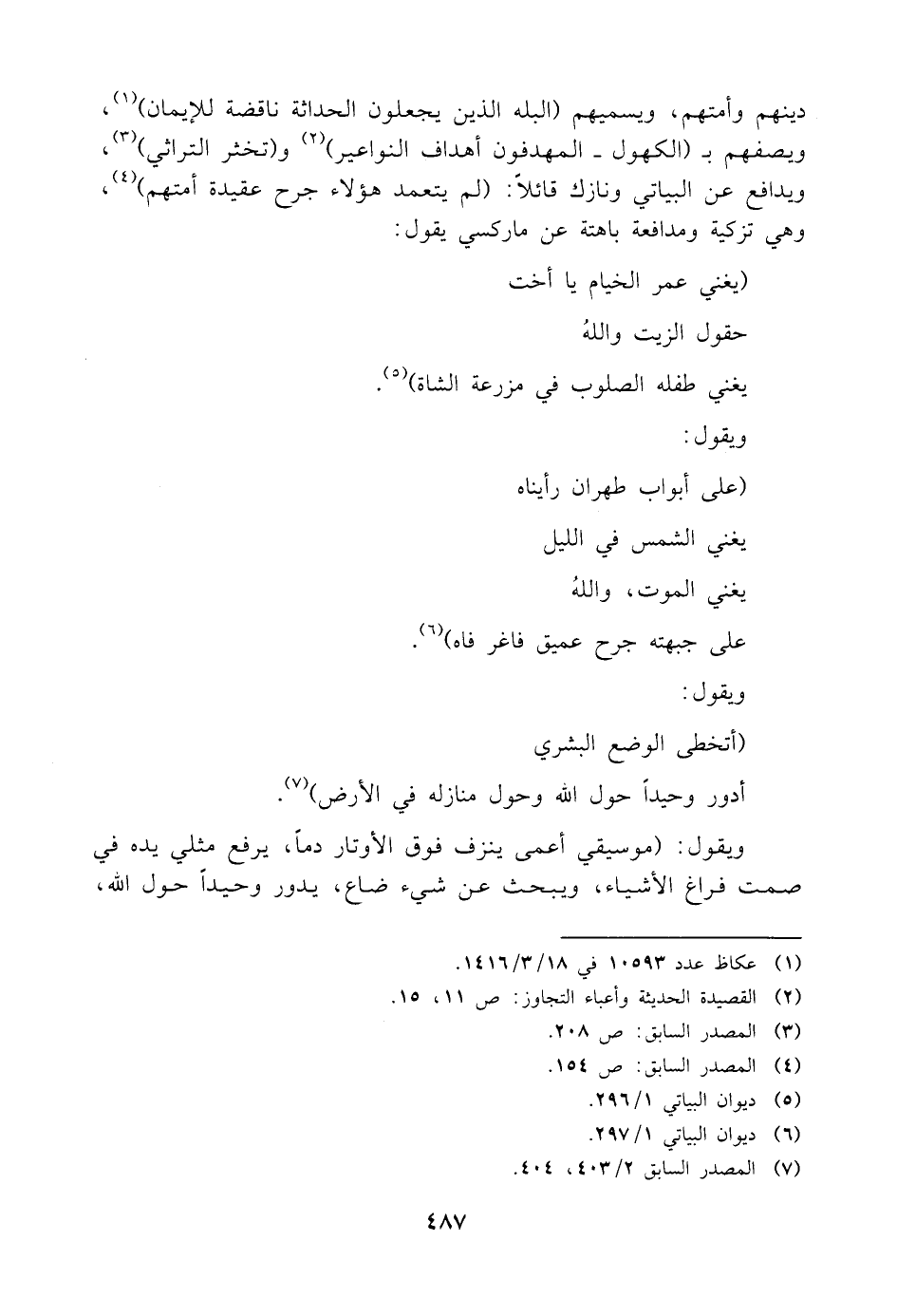 دينهم وأمتهم، ويسممِهم (البله الذين يجعلون الحداثة ناقضة للإيمان) (¬١)، ويصفهم بـ (الكهول - المهدفون أهداف النواعير) (¬٢) و (تخثر التراثي) (¬٣)، ويدافع عن البياتي ونازك قائلًا: (لم يتعمد هؤلاء جرح عقيدة أمتهم) (¬٤)، وهي تزكية ومدافعة باهتة عن ماركسي يقول: