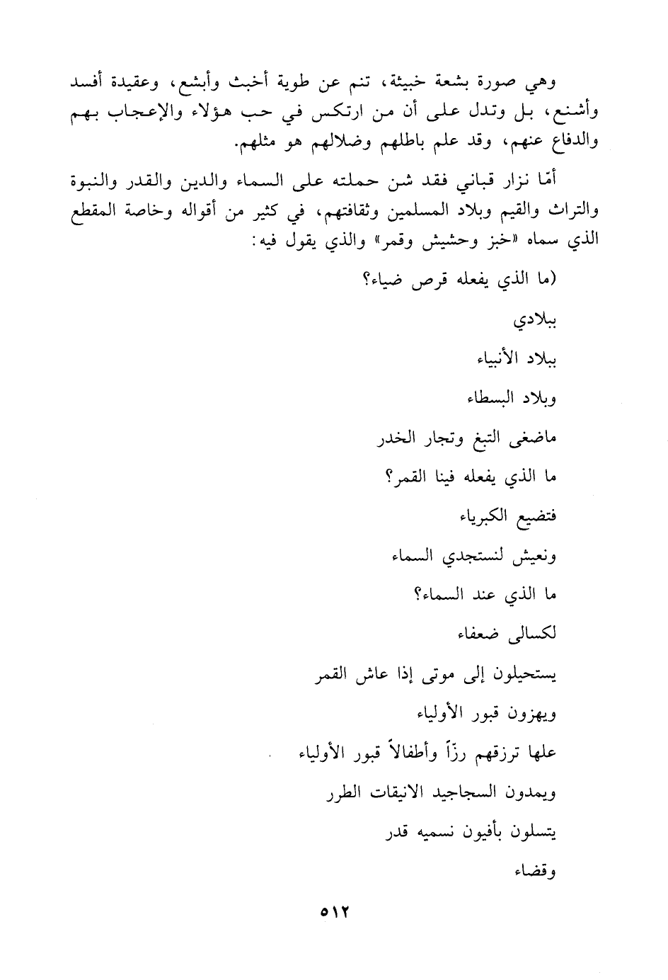 أمّا نزار قباني فقد شن حملته على السماء والدين والقدر والنبوة والتراث والقيم وبلاد المسلمين وثقافتهم، في كثير من أقواله وخاصة المقطع الذي سماه "خبز وحشيش وقمر" والذي يقول فيه: