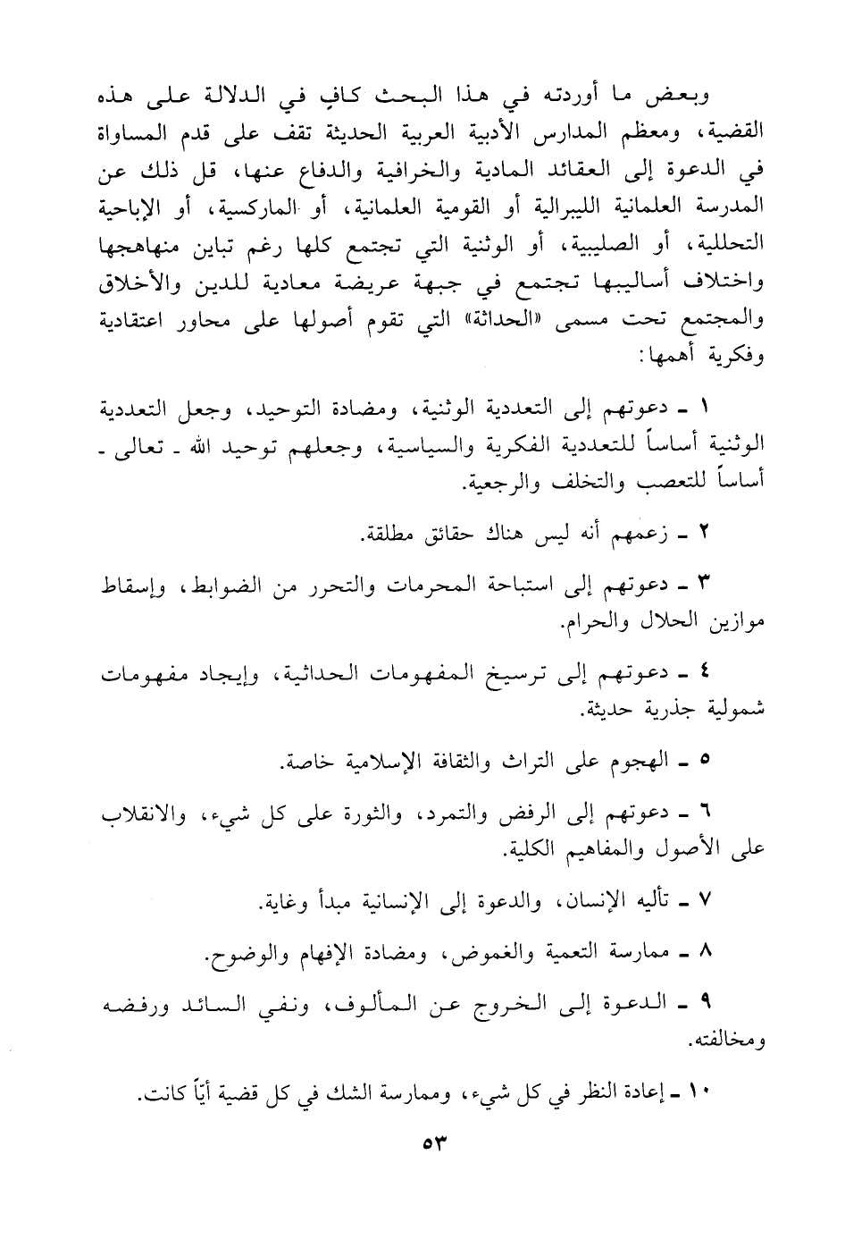 وبعض ما أوردته في هذا البحث كافٍ في الدلالة على هذه القضية، ومعظم المدارس الأدبية العربية الحديثة تقف على قدم المساواة في الدعوة إلى العقائد المادية والخرافية والدفاع عنها، قل ذلك عن المدرسة العلمانية الليبرالية أو القومية العلمانية، أو الماركسية، أو الإباحية التحللية، أو الصليبية، أو الوثنية التي تجتمع كلها رغم تباين منهاهجها واختلاف أساليبها تجتمع في جبهة عريضة معادية للدين والأخلاق والمجتمع تحت مسمى "الحداثة" التي تقوم أصولها على محاور اعتقادية وفكرية أهمها: