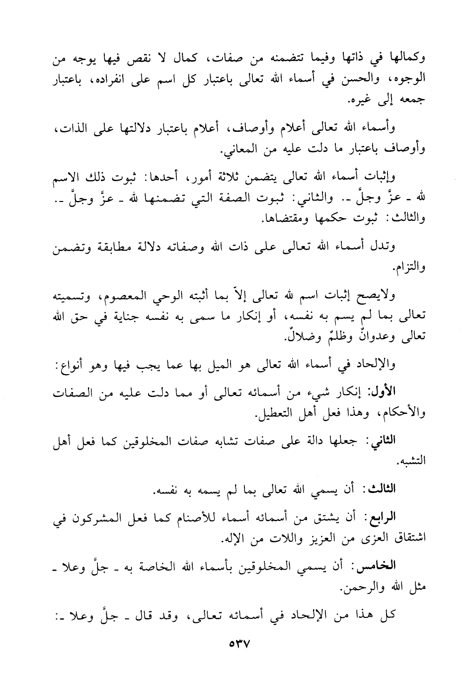 وإثبات أسماء اللَّه تعالى يتضمن ثلاثة أمور، أحدها: ثبوت ذلك الاسم للَّه -عزَّ وجلَّ-. والثاني: ثبوت الصفة التي تضمنها للَّه -عزَّ وجلَّ-. والثالث: ثبوت حكمها ومقتضاها.