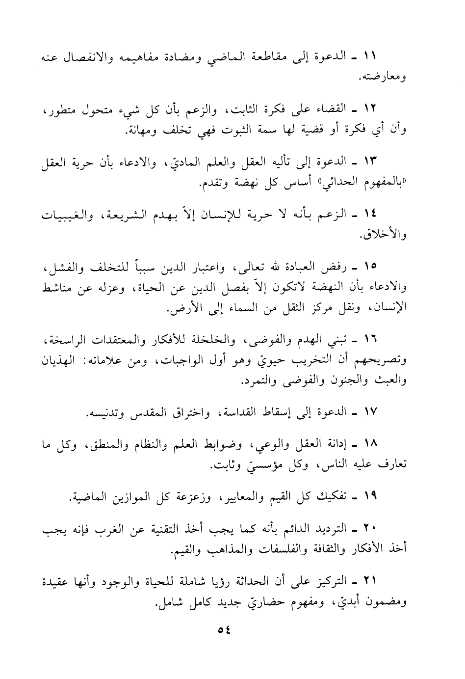 ٢١ - التركيز على أن الحداثة رؤيا شاملة للحياة والوجود وأنها عقيدة ومضمون أبديّ، ومفهوم حضاريّ جديد كامل شامل.