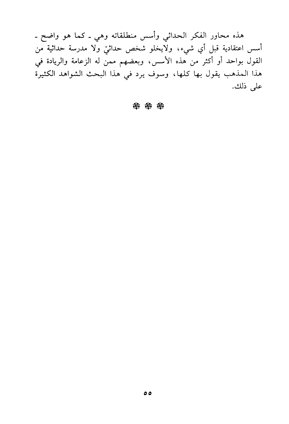 هذه محاور الفكر الحداثي وأسس منطلقاته وهي -كما هو واضح- أسس اعتقادية قبل أي شيء، ولا يخلو شخص حداثيّ ولا مدرسة حداثية من القول بواحد أو أكثر من هذه الأسس، وبعضهم ممن له الزعامة والريادة في هذا المذهب يقول بها كلها، وسوف يرد في هذا البحث الشواهد الكثيرة على ذلك.