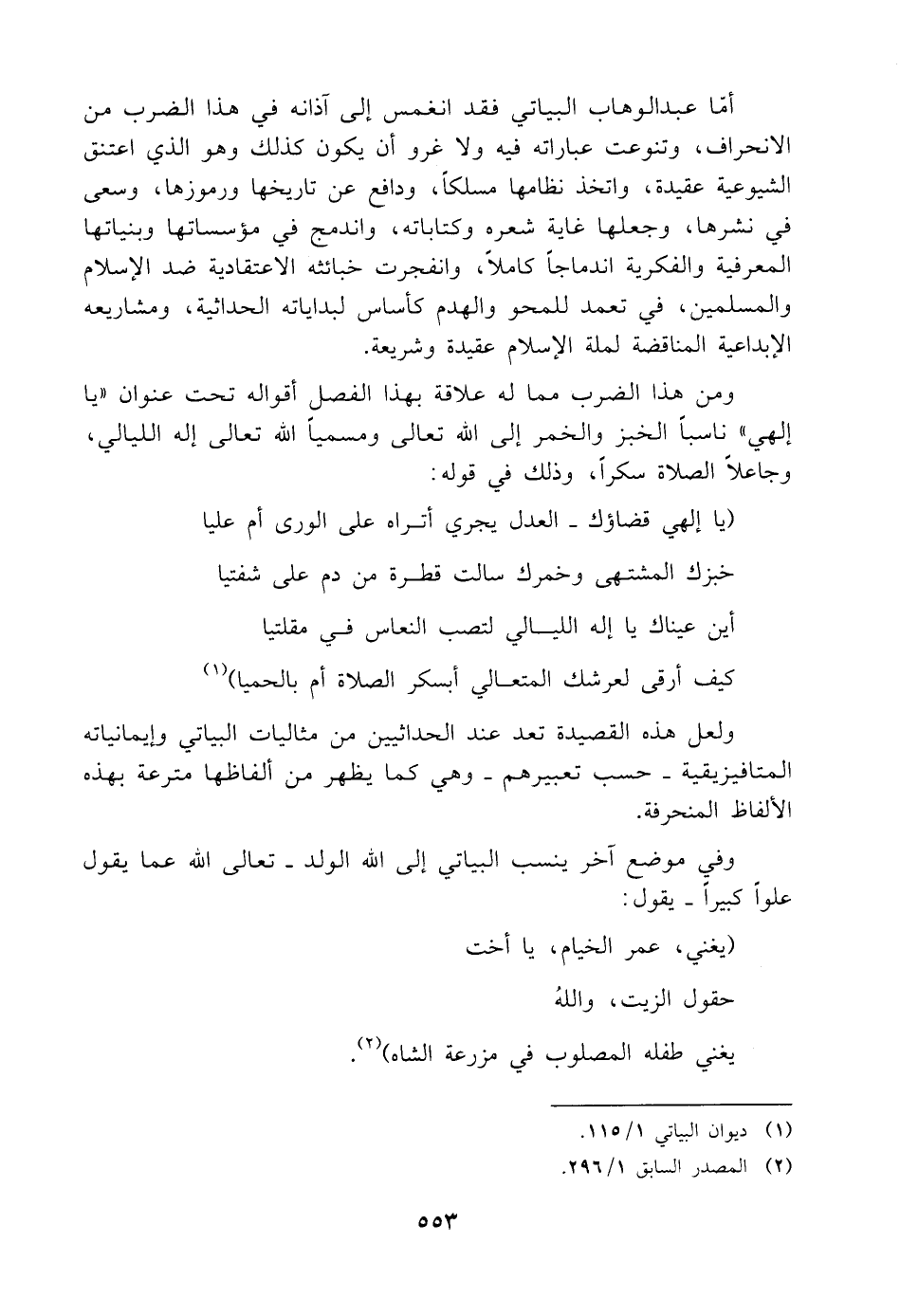 أمّا عبد الوهاب البياتي فقد انغمس إلى آذانه في هذا الضرب من الانحراف، وتنوعت عباراته فيه ولا غرو أن يكون كذلك وهو الذي اعتنق الشيوعية عقيدة، واتخذ نظامها مسلكًا، ودافع عن تاريخها ورموزها، وسعى في نشرها، وجعلها غاية شعره وكتاباته، واندمج في مؤسساتها وبنياتها المعرفية والفكرية اندماجًا كاملًا، وانفجرت خبائثه الاعتقادية ضد الإسلام والمسلمين، في تعمد للمحو والهدم كأساس لبداياته الحداثية، ومشاريعه الإبداعية المناقضة لملة الإسلام عقيدة وشريعة.