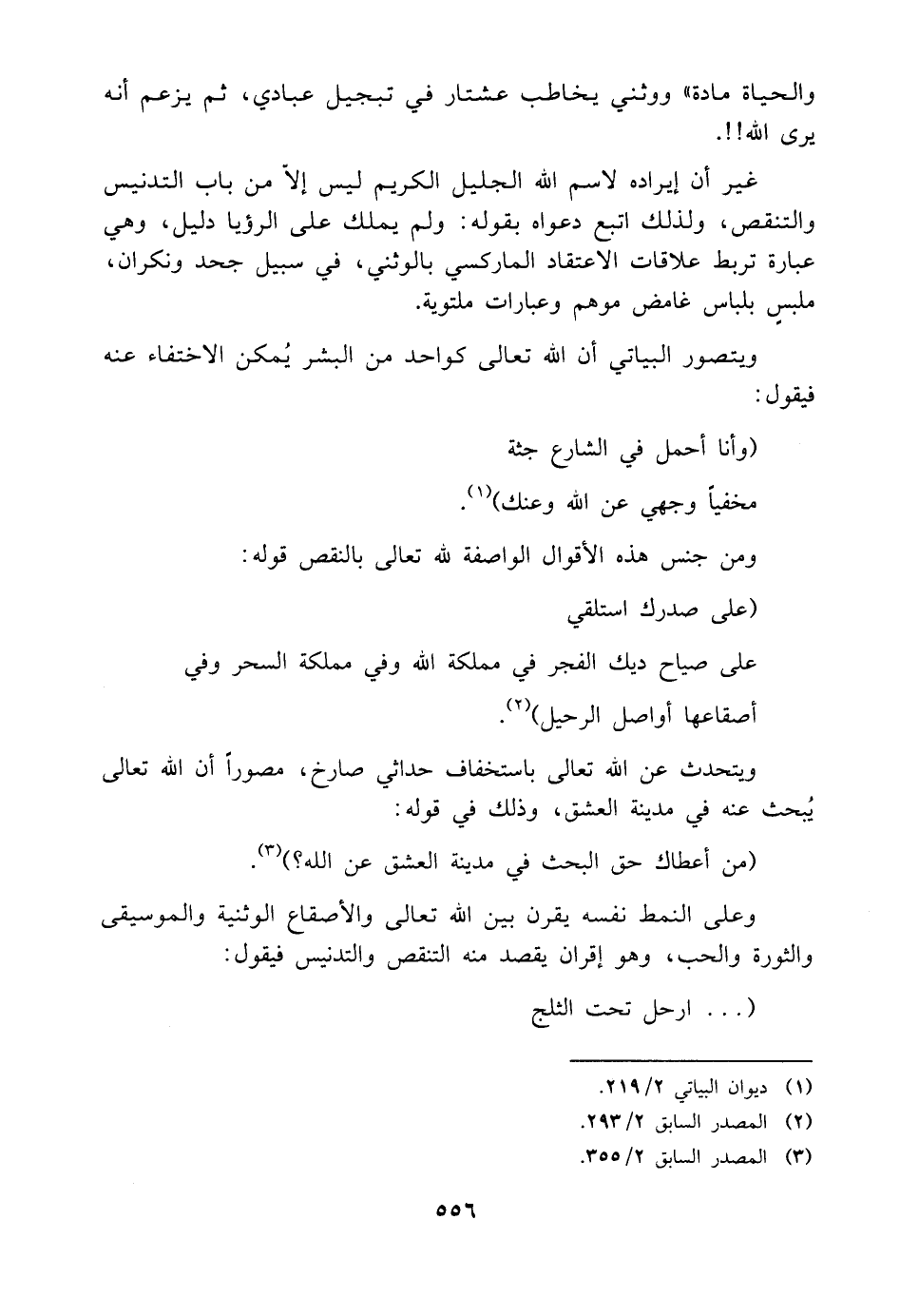 وعلى النمط نفسه يقرن بين اللَّه تعالى والأصقاع الوثنية والموسيقى والثورة والحب، وهو إقران يقصد منه التنقص والتدنيس فيقول: