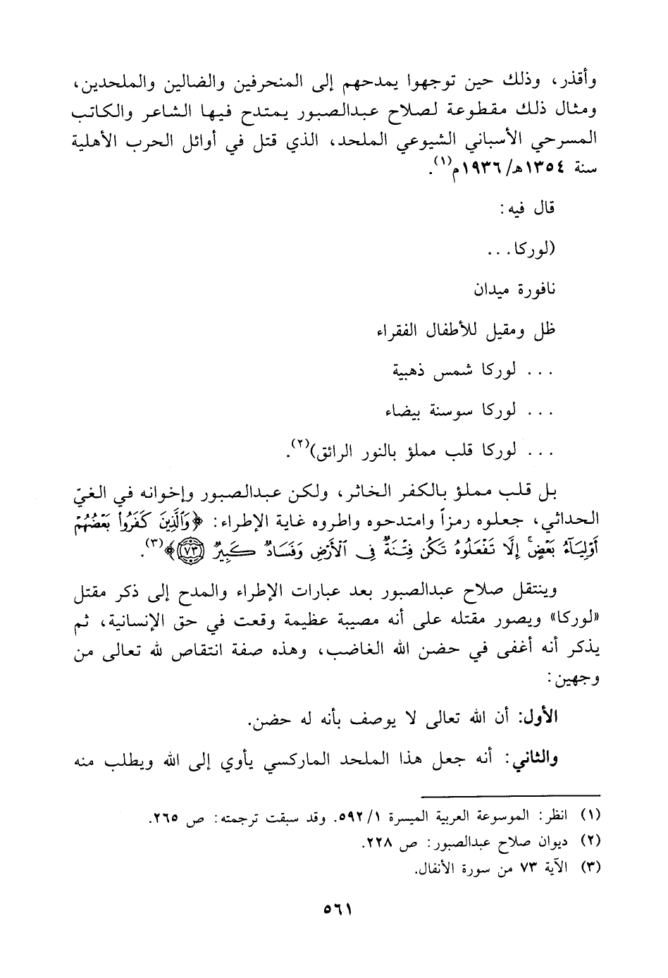 وأقذر، وذلك حين توجهوا يمدحهم إلى المنحرفين والضالين والملحدين، ومثال ذلك مقطوعة لصلاح عبد الصبور يمتدح فيها الشاعر والكاتب المسرحي الأسباني الشيوعي الملحد، الذي قتل في أوائل الحرب الأهلية سنة ١٣٥٤ هـ/ ١٩٣٦ م (¬١).