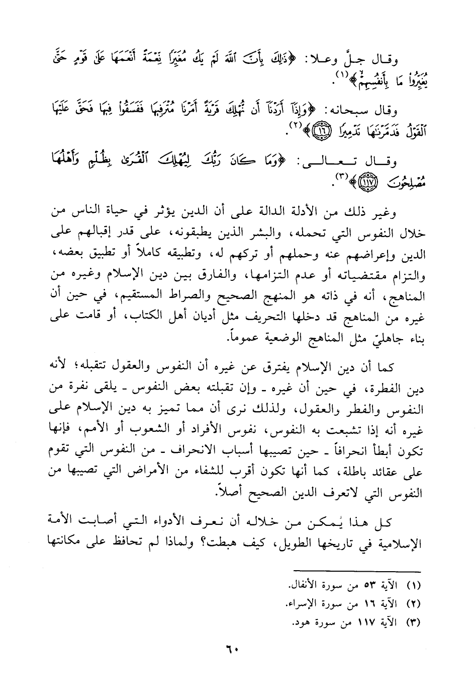وغير ذلك من الأدلة الدالة على أن الدين يؤثر في حياة الناس من خلال النفوس التي تحمله، والبشر الذين يطبقونه، على قدر إقبالهم على الدين وإعراضهم عنه وحملهم أو تركهم له، وتطبيقه كاملًا أو تطبيق بعضه، والتزام مقتضياته أو عدم التزامها، والفارق بين دين الإسلام وغيره من المناهج، أنه في ذاته هو المنهج الصحيح والصراط المستقيم، في حين أن غيره من المناهج قد دخلها التحريف مثل أديان أهل الكتاب، أو قامت على بناء جاهليّ مثل المناهج الوضعية عمومًا.