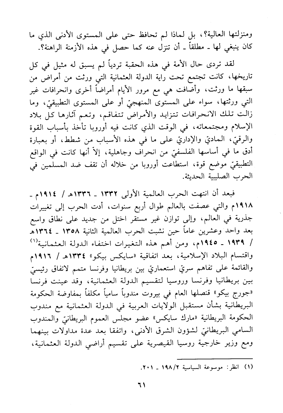 فبعد أن انتهت الحرب العالمية الأولى ١٣٣٢ - ١٣٣٦ هـ/ ١٩١٤ م - ١٩١٨ م والتي عصفت بالعالم طوال أربع سنوات، أدت الحرب إلى تغييرات جذرية في العالم، وإلى توازن غير مستقر اختل من جديد على نطاق واسع بعد واحد وعشرين عامًا حين نشبت الحرب العالمية الثانية ١٣٥٨ - ١٣٦٤ هـ/ ١٩٣٩ - ١٩٤٥ م، ومن هم هذه التغيرات اختفاء الدولة العثمانية (¬١) واقتسام البلاد الإسلامية، بعد اتفاقية "سايكس بيكو" ١٣٣٤ هـ/ ١٩١٦ م والقائمة على تفاهم سريّ استعماريّ بين بريطانيا وفرنسا متمم لاتفاق رئيسيّ بين بريطانيا وفرنسا وروسيا لتقسيم الدولة العثمانية، وقد عينت فرنسا "جورج بيكو" قنصلها العام في بيروت مندوبًا ساميًا مكلفًا بمفاوضة الحكومة البريطانية بشأن مستقبل الولايات العربية في الدولة العثمانية مع مندوب الحكومة البريطانية "مارك سايكس" عضو مجلس العموم البريطاني والمندوب السامي البريطاني لشؤون الشرق الأدنى، واتفقا بعد عدة مداولات بينهما ومع وزير خارجية روسيا القيصرية على تقسيم أراضي الدولة العثمانية،