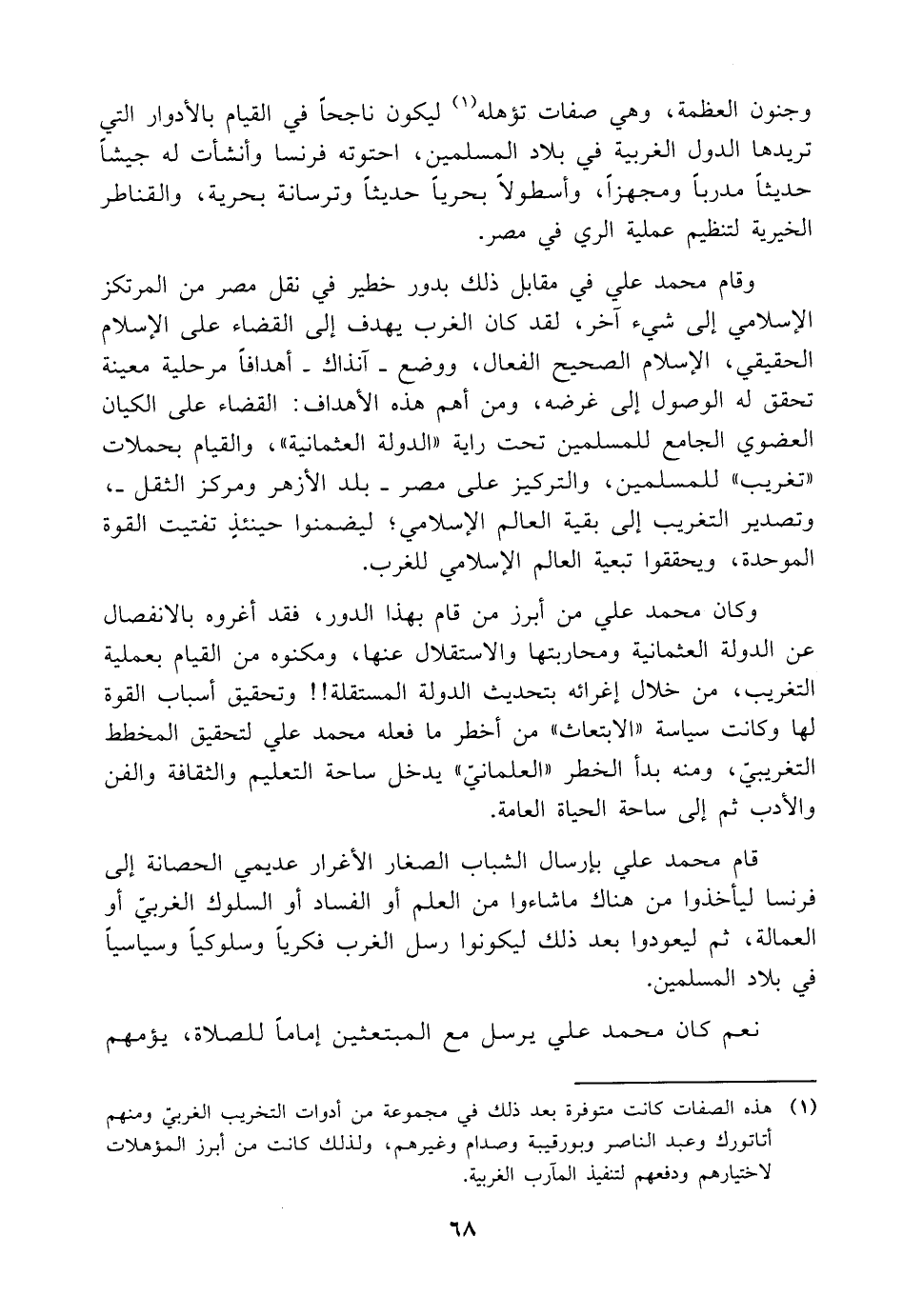 (¬١) هذه الصفات كانت متوفرة بعد ذلك في مجموعة من أدوات التخريب الغربيّ ومنهم أتاتورك وعبد الناصر وبورقيبة وصدام وغيرهم، ولذلك كانت من أبرز المؤهلات لاختيارهم ودفعهم لتنفيذ المآرب الغربية.