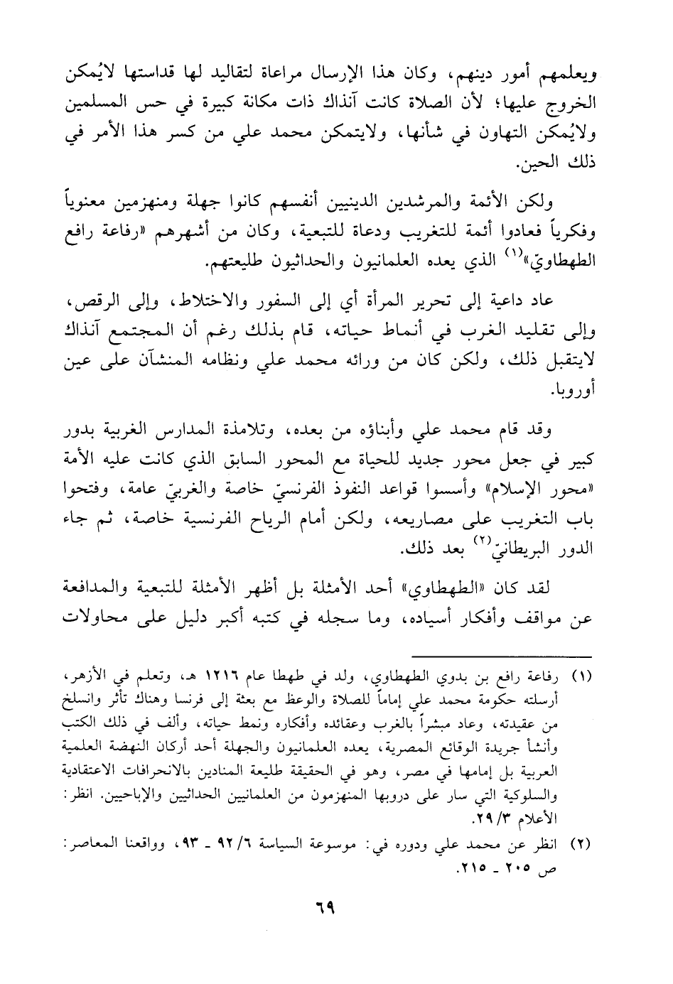 ولكن الأئمة والمرشدين الدينيين أنفسهم كانوا جهلة ومنهزمين معنويًا وفكريًا فعادوا أئمة للتغريب ودعاة للتبعية، وكان من أشهرهم "رفاعة رافع الطهطاوي" (¬١) الذي يعده العلمانيون والحداثيون طليعتهم.