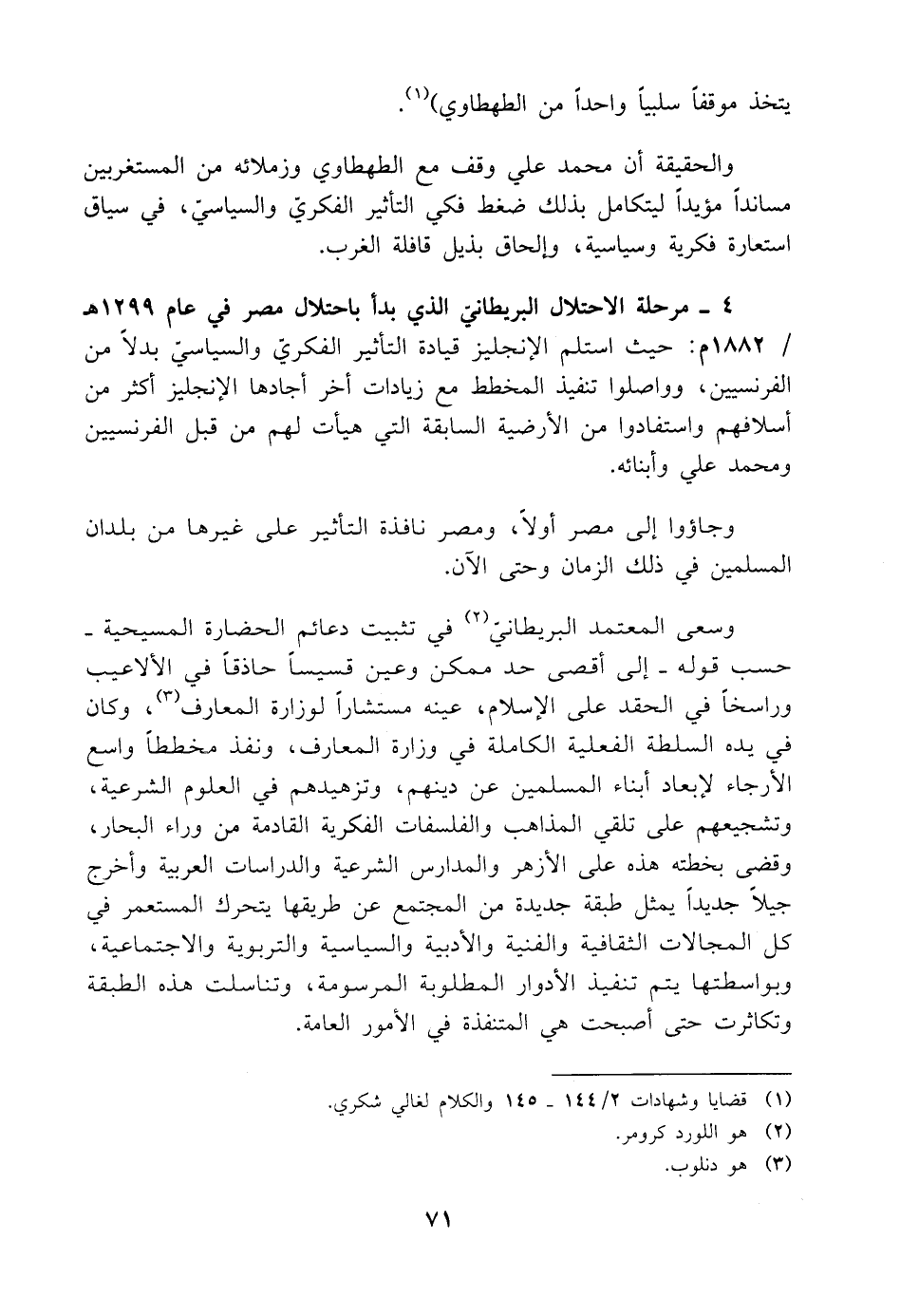 ٤ - مرحلة الاحتلال البريطاني الذي بدأ باحتلال مصر في عام ١٢٩٩ هـ/ ١٨٨٢ م: حيث استلم الإنجليز قيادة التأثير الفكريّ والسياسيّ بدلًا من الفرنسيين، وواصلوا تنفيذ المخطط مع زيادات أخر أجادها الإنجليز أكثر من أسلافهم واستفادوا من الأرضية السابقة التي هيأت لهم من قبل الفرنسيين ومحمد علي وأبنائه.
