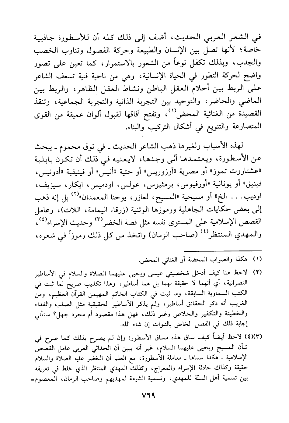 (¬٣) و (¬٤) لاحظ أيضًا كيف ساق هذه مساق الأسطورة وإن لم يصرح بذلك كما صرح في شأن المسيح ويحيى عليهما السلام، غير أنه يبين أن الحداثي العربي عامل القصص الإسلامية -هكذا سماها- معاملة الأسطورة، مع العلم أن الخضر عليه الصلاة والسلام حقيقة وكذلك حادثة الإسراء والمعراج، وكذلك المهدي المنتظر الذي خلط في تعريفه بين تسمية أهل السنة للمهدي، وتسمية الشيعة لمهديهم وصاحب الزمان، المعصوم =