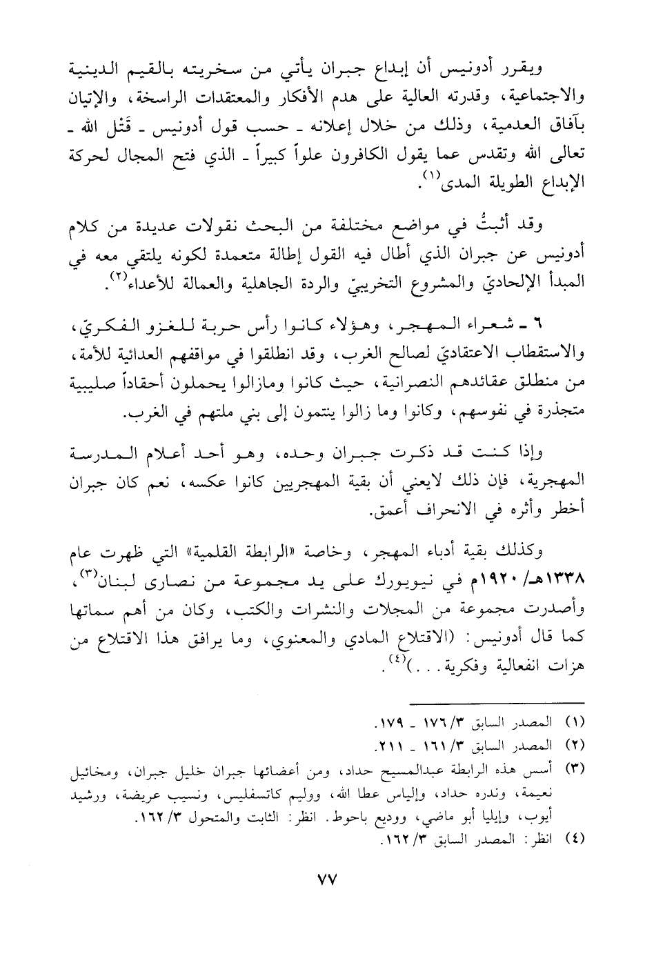 وقد أثبتُّ في مواضع مختلفة من البحث نقولات عديدة من كلام أدونيس عن جبران الذي أطال فيه القول إطالة متعمدة لكونه يلتقي معه في المبدأ الإلحاديّ والمشروع التخريبيّ والردة الجاهلية والعمالة للأعداء (¬٢).