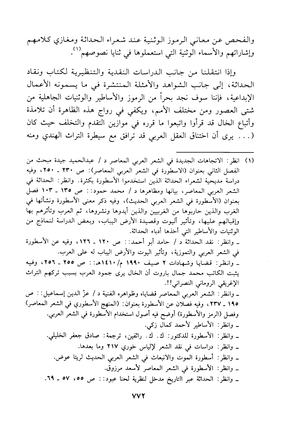 (¬١) انظر: الاتجاهات الجديدة في الشعر العربي المعاصر د/ عبد الحميد جيدة مبحث من الفصل الثاني بعنوان (الاسطورة في الشعر العربي المعاصر): ص ٢٣٠ - ٢٥٠، وفيه دراسة مديحية لشعراء الحداثة الذين استخدموا الأسطورة بكثرة. وانظر: الحداثة في الشعر العربي المعاصر، بيانها ومظاهرها د/ محمد حمود: ص ١٣٥ - ١٠٣ فصل بعنوان (الأسطورة في الشعر العربي الحديث)، وفيه ذكر معنى الأسطورة ونشأتها في الغرب والذين حاربوها من الغربيين والذين أيدوها ونشروها، ثم العرب وتأثرهم بها وإقبالهم عليها، وتأثير أليوت وقصيدة الأرض اليباب، وبعض الدراسة لنماذج من الوثنيات والأساطير التي أخذها أدباء الحداثة.