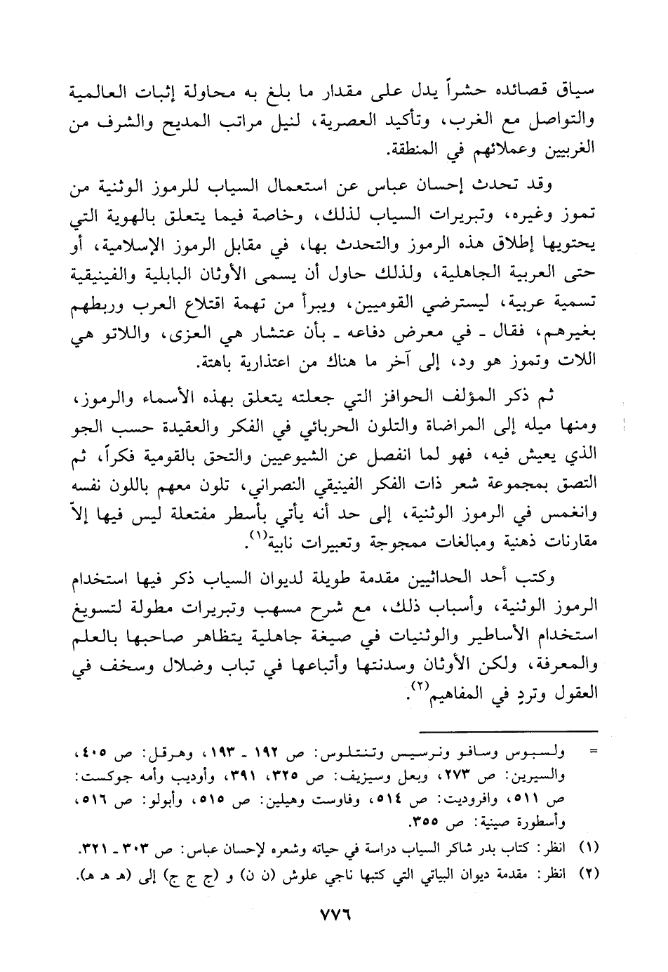 وقد تحدث إحسان عباس عن استعمال السياب للرموز الوثنية من تموز وغيره، وتبريرات السياب لذلك، وخاصة فيما يتعلق بالهوية التي يحتويها إطلاق هذه الرموز والتحدث بها، في مقابل الرموز الإسلامية، أو حتى العربية الجاهلية، ولذلك حاول أن يسمى الأوثان البابلية والفينيقية تسمية عربية، ليسترضي القوميين، ويبرأ من تهمة اقتلاع العرب وربطهم بغيرهم، فقال -في معرض دفاعه- بأن عتشار هي العزى، واللاتو هي اللات وتموز هو ود، إلى آخر ما هناك من اعتذارية باهتة.