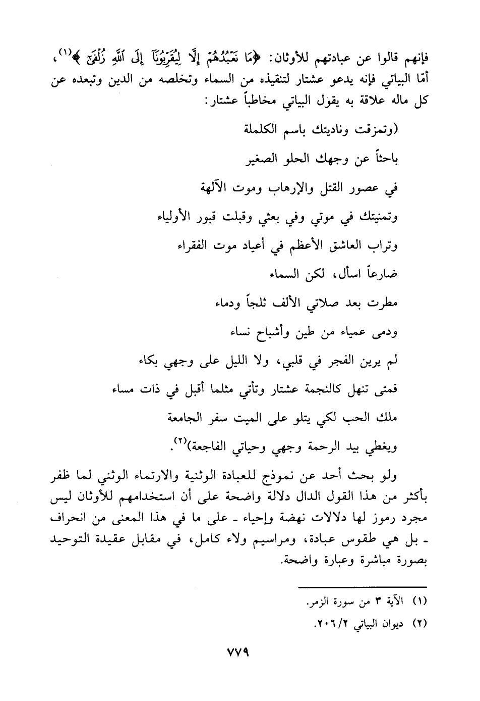 فإنهم قالوا عن عبادتهم للأوثان: {مَا نَعْبُدُهُمْ إِلَّا لِيُقَرِّبُونَا إِلَى اللَّهِ زُلْفَى} (¬١)، أمّا البياتي فإنه يدعو عشتار لتنقيذه من السماء وتخلصه من الدين وتبعده عن كل ما له علاقة به يقول البياتي مخاطبًا عشتار: