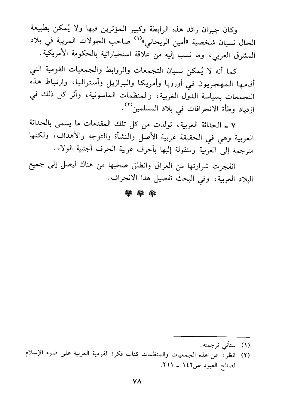 كما أنه لا يُمكن نسيان التجمعات والروابط والجمعيات القومية التي أقامها المهجريون في أوروبا وأمريكا والبرازيل وأستراليا، وارتباط هذه التجمعات بسياسة الدول الغربية، والمنظمات الماسونية، وأثر كل ذلك في ازدياد وطأة الانحرافات في بلاد المسلمين (¬٢).