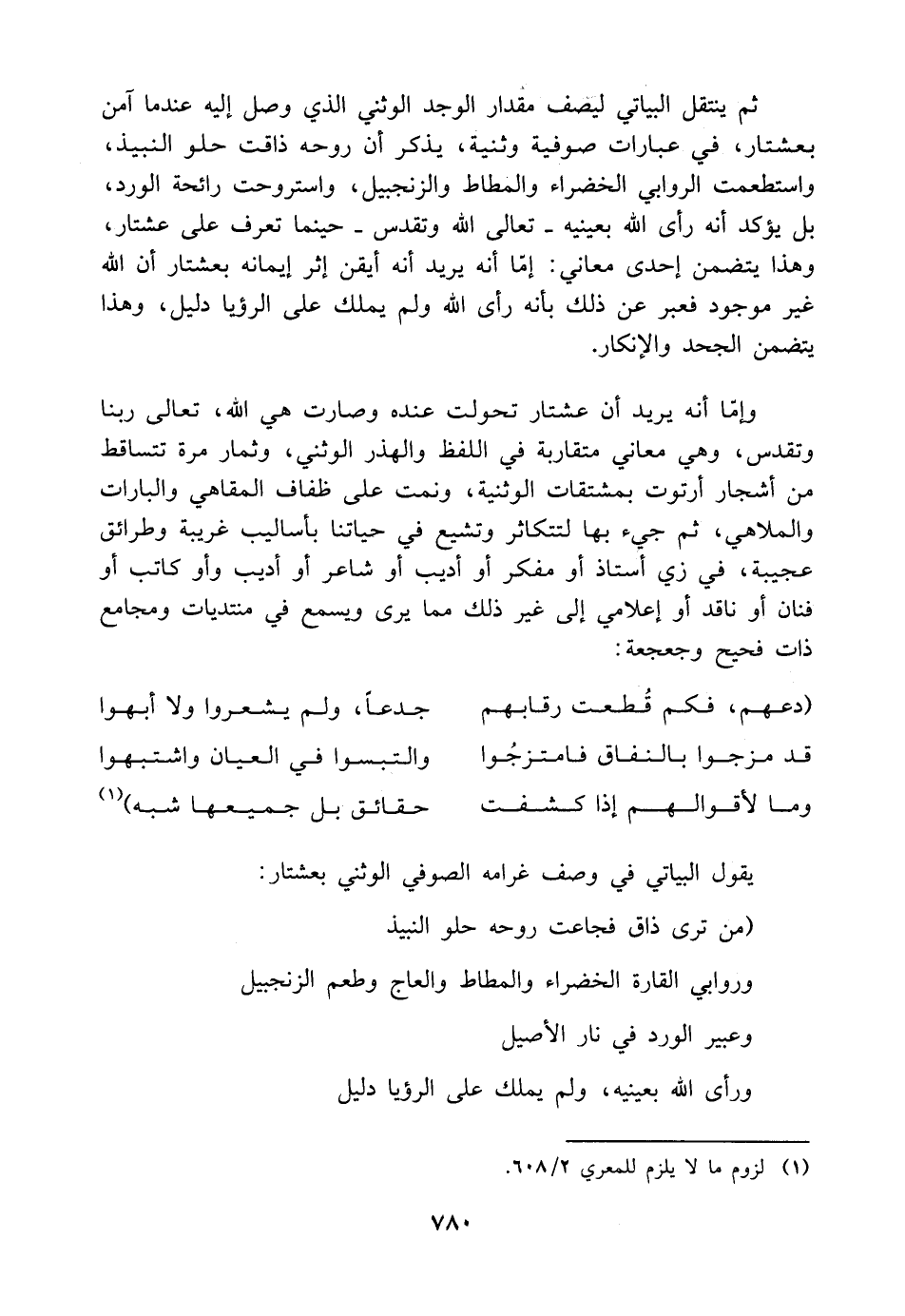 وإما أنه يريد أن عشتار تحولت عنده وصارت هي اللَّه، تعالى ربنا وتقدس، وهي معاني متقاربة في اللفظ والهذر الوثني، وثمار مرة تتساقط من أشجار أرتوت بمشتقات الوثنية، ونمت على ظفاف المقاهي والبارات والملاهي، ثم جيء بها لتتكاثر وتشيع في حياتنا بأساليب غريبة وطرائق عجيبة، في زي أستاذ أو مفكر أو أديب أو شاعر أو أديب أو كاتب أو فنان أو ناقد أو إعلامي إلى غير ذلك مما يرى ويسمع في منتديات ومجامع ذات فحيح وجعجعة: