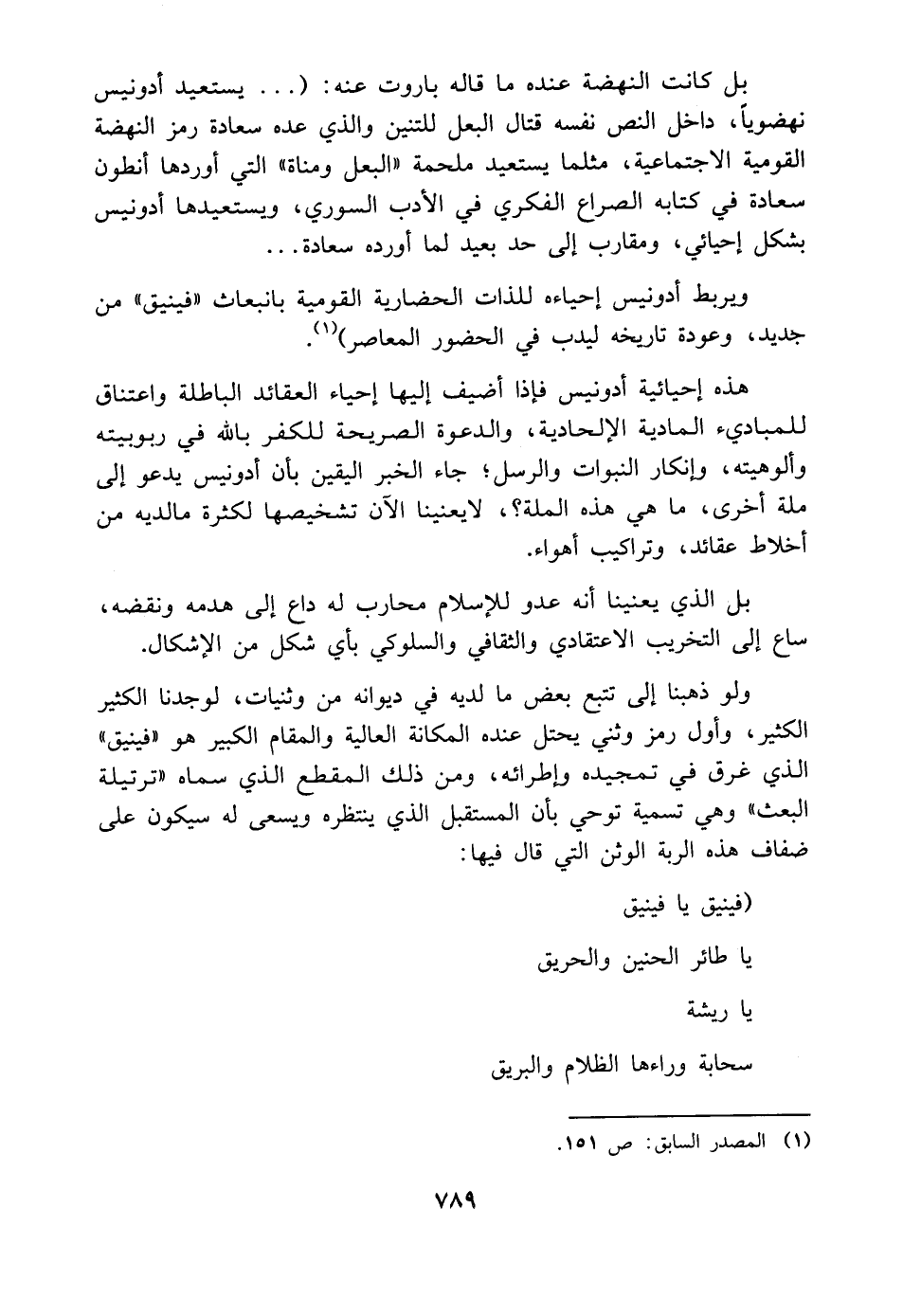 ويربط أدونيس إحياءه للذات الحضارية القومية بانبعاث "فينيق" من جديد، وعودة تاريخه ليدب في الحضور المعاصر) (¬١).