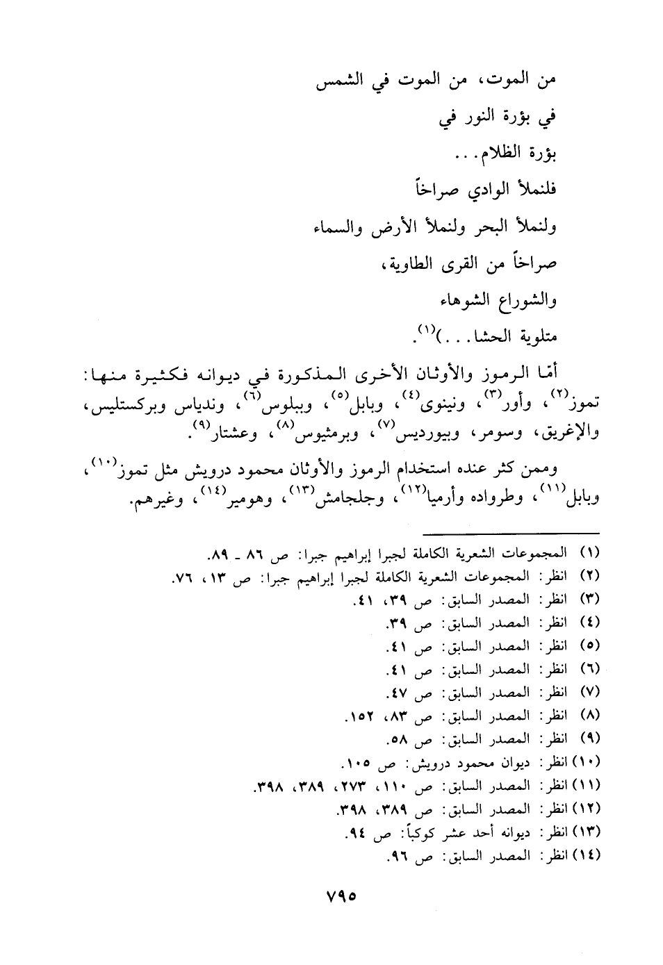 وممن كثر عنده استخدام الرموز والأوثان محمود درويش مثل تموز (¬١٠)، وبابل (¬١١)، وطرواده وأرميا (¬١٢)، وجلجامش (¬١٣)، وهومير (¬١٤)، وغيرهم.