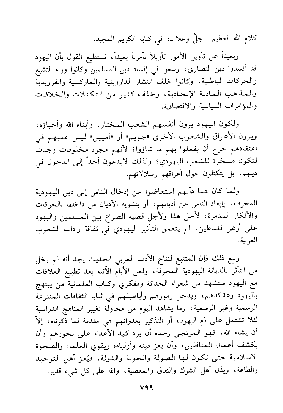 ومع ذلك فإن المتتبع لنتاج الأدب العربي الحديث يجد أنه لم يخل من التأثر بالديانة اليهودية المحرفة، ولعل الأيام الآتية بعد تطبيع العلاقات مع اليهود ستشهد من شعراء الحداثة ومفكري وكتاب العلمانية من يبتهج باليهود وعقائدهم، ويدخل رموزهم وأباطيلهم في ثنايا الثقافات المتنوعة الرسمية وغير الرسمية، وما يشاهد اليوم من محاولة تغيير المناهج الدراسية لئلا تشتمل على ذم اليهود، أو التذكير بعدواتهم هي مقدمة لما ذكرناه، إلا أن يشاء اللَّه، فهو المرتجى وحده أن يرد كيد الأعداء على نحورهم وأن يكشف أعمال المنافقين، وأن يعز دينه وأولياءه ويقوي العلماء والصحوة الإسلامية حتى تكون لها الصولة والجولة والدولة، فيُعز أهل التوحيد والطاعة، ويذل أهل الشرك والنفاق والمعصية، واللَّه على كل شيء قدير.