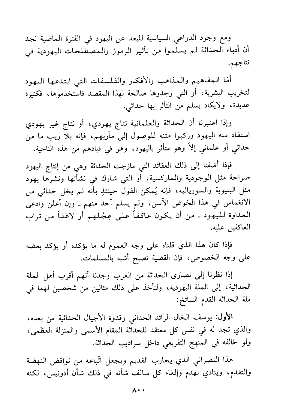 فإذا أضفنا إلى ذلك العقائد التي مازجت الحداثة وهي من إنتاج اليهود صراحة مثل الوجودية والماركسية، أو التي شارك في نشأتها ونشرها يهود مثل البنيوية والسوريالية، فإنه يُمكن القول حينئذٍ بأنه لم يخل حداثي من الانغماس في هذا الخوض الآسن، ولم يسلم أحد منهم -وإن أعلن وادعى العداوة لليهود- من أن يكون عاكفًا على عِجْلهم أو لاعقًا من تراب العاكفين عليه.