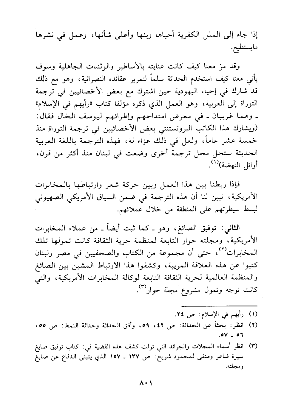 الثاني: توفيق الصائغ، وهو -كما ثبت أيضًا- من عملاء المخابرات الأمريكية، ومجلته حوار التابعة لمنظمة حرية الثقافة كانت تمولها تلك المخابرات (¬٢)، حتى أن مجموعة من الكتاب والصحفيين في مصر ولبنان كتبوا عن هذه العلاقة المريبة، وكشفوا هذا الارتباط المشين بين الصائغ والمنظمة العالمية لحرية الثقافة التابعة لوكالة المخابرات الأمريكية، والتي كانت توجه وتمول مشروع مجلة حوار (¬٣).