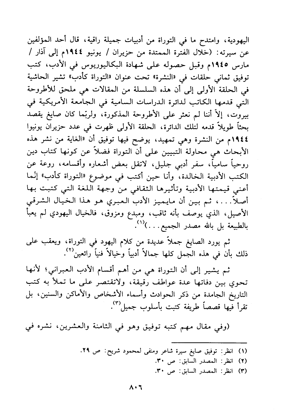 اليهودية، وامتدح ما في التوراة من أدبيات جميلة راقية، قال أحد المؤلفين عن سيرته: (خلال الفترة الممتدة من حزيران/ يونيو ١٩٤٤ م إلى آذار/ مارس ١٩٤٥ م وقبل حصوله على شهادة البكاليوريوس في الأدب، كتب توفيق ثماني حلقات في "النشرة" تحت عنوان "التوراة كأدب" تشير الحاشية في الحلقة الأولى إلى أن هذه السلسلة من المقالات هي ملحق للأطروحة التي قدمها الكاتب لدائرة الدراسات السامية في الجامعة الأمريكية في بيروت، إلّا أننا لم نعثر على الأطروحة المذكورة، ولربّما كان صايغ يقصد بحثًا طويلًا قدمه لتلك الدائرة، الحلقة الأولى ظهرت في عدد حزيران يونيو ١٩٤٤ م من النشرة وهي تمهيد، يوضح فيها توفيق أن "الغاية من نشر هذه الأبحاث هي محاولة التبيين على أن التوراة فضلًا عن كونها كتاب دين روحيًا ساميًا، سفر أدبي جليل، لا تقل بعض أشعاره وأقسامه، روعة عن الكتب الأدبية الخالدة، وأنا حين أكتب في موضوع "التوراة كأدب" إنَّما أعني قيمتها الأدبية وتأثيرها الثقافي من وجهة اللغة التي كتبت بها أصلًا. . .، ثم بين أن ما يميز الأدب العبري هو هذا الخيال الشرقي الأصيل، الذي يوصف بأنه ثاقب، ومبدع ومزوق، فالخيال اليهودي لم يعبأ بالطبيعة بل باللَّه مصدر الجميع. . .) (¬١).