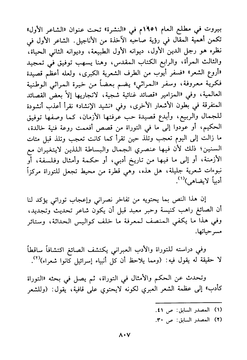 بيروت في مطلع العام ١٩٥١ م في "النشرة" تحت عنوان "الشاعر الأول" تكمن أهمية المقال في رؤية صاحبه الآخذة من الأناجيل. الشاعر الأول في نظره هو رجل الدين الأول، ديوانه الأول الطبيعة، وديوانه الثاني الحياة، والثالث المرأة، والرابع الكتاب المقدس، وهنا يسهب توفيق في تمجيد "أروع الشعر" "فسفر أيوب من الطرف الشعرية الكبرى، ولعله أعظم قصيدة فكرية معروفة، وسفر "المراثي" يضم بعضًا من خيرة المراثي الوطنية العالمية، وفي "المزامير "قصائد غنائية شجية، لا تجاريها إلَّا بعض القصائد المتفرقة في بطون الأشعار الأخرى، وفي "نشيد الإنشاد" نقرأ أعذب أنشودة للجمال والربيع، وأبدع قصيدة حب عرفتها الأزمان، كما وصفها توفيق الحكيم، أو عودوا إلى ما في التوراة من قصص أفعمت روعة فنية خالدة، ما زالت إلى اليوم تعجب وتلذ حين تقرأ كما كانت تعجب وتلذ قبل مئات السنين؛ ذلك لأن فيها عنصري الجمال والبساطة اللذين لا يتغيران مع الأزمنة، أو إلى ما فيها من تاريخ أدبي، أو حكمة وأمثال وفلسفة، أو نبوءات شعرية جليلة، هل هذه، وهي قطرة من محيط تجعل للتوراة مركزًا أدبيًا لا يضاهى) (¬١).