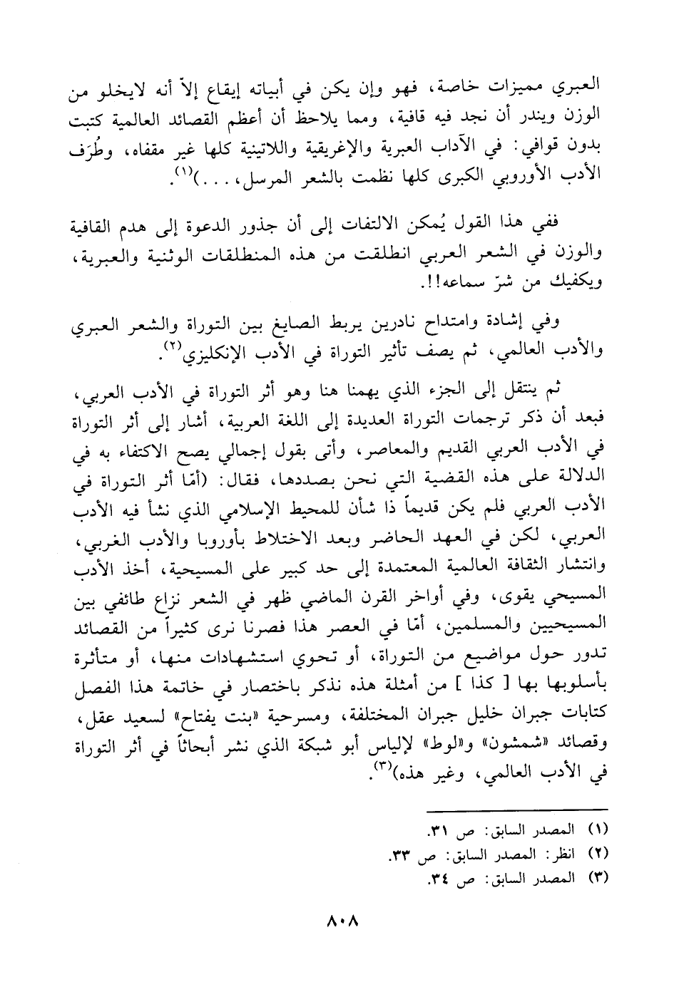ثم ينتقل إلى الجزء الذي يهمنا هنا وهو أثر التوراة في الأدب العربي، فبعد أن ذكر ترجمات التوراة العديدة إلى اللغة العربية، أشار إلى أثر التوراة في الأدب العربي القديم والمعاصر، وأتى بقول إجمالي يصح الاكتفاء به في الدلالة على هذه القضية التي نحن بصددها، فقال: (أمّا أثر التوراة في الأدب العربي فلم يكن قديمًا ذا شأن للمحيط الإسلامي الذي نشأ فيه الأدب العربي، لكن في العهد الحاضر وبعد الاختلاط بأوروبا والأدب الغربي، وانتشار الثقافة العالمية المعتمدة إلى حد كبير على المسيحية، أخذ الأدب المسيحي يقوى، وفي أواخر القرن الماضي ظهر في الشعر نزاع طائفي بين المسيحيين والمسلمين، أما في العصر هذا فصرنا نرى كثيرًا من القصائد تدور حول مواضيع من التوراة، أو تحوي استشهادات منها، أو متأثرة بأسلوبها بها [كذا] من أمثلة هذه نذكر باختصار في خاتمة هذا الفصل كتابات جبران خليل جبران المختلفة، ومسرحية "بنت يفتاح" لسعيد عقل، وقصائد "شمشون" و"لوط" لإلياس أبو شبكة الذي نشر أبحاثًا في أثر التوراة في الأدب العالمي، وغير هذه) (¬٣).