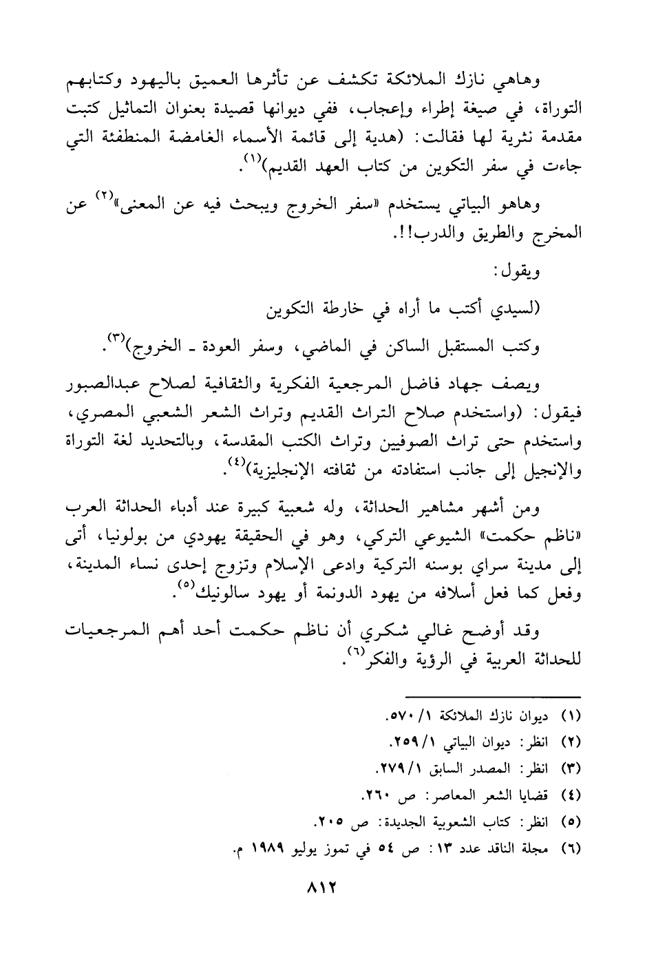 وها هي نازك الملائكة تكشف عن تأثرها العميق باليهود وكتابهم التوراة، في صيغة إطراء وإعجاب، ففي ديوانها قصيدة بعنوان التماثيل كتبت مقدمة نثرية لها فقالت: (هدية إلى قائمة الأسماء الغامضة المنطفئة التي جاءت في سفر التكوين من كتاب العهد القديم) (¬١).