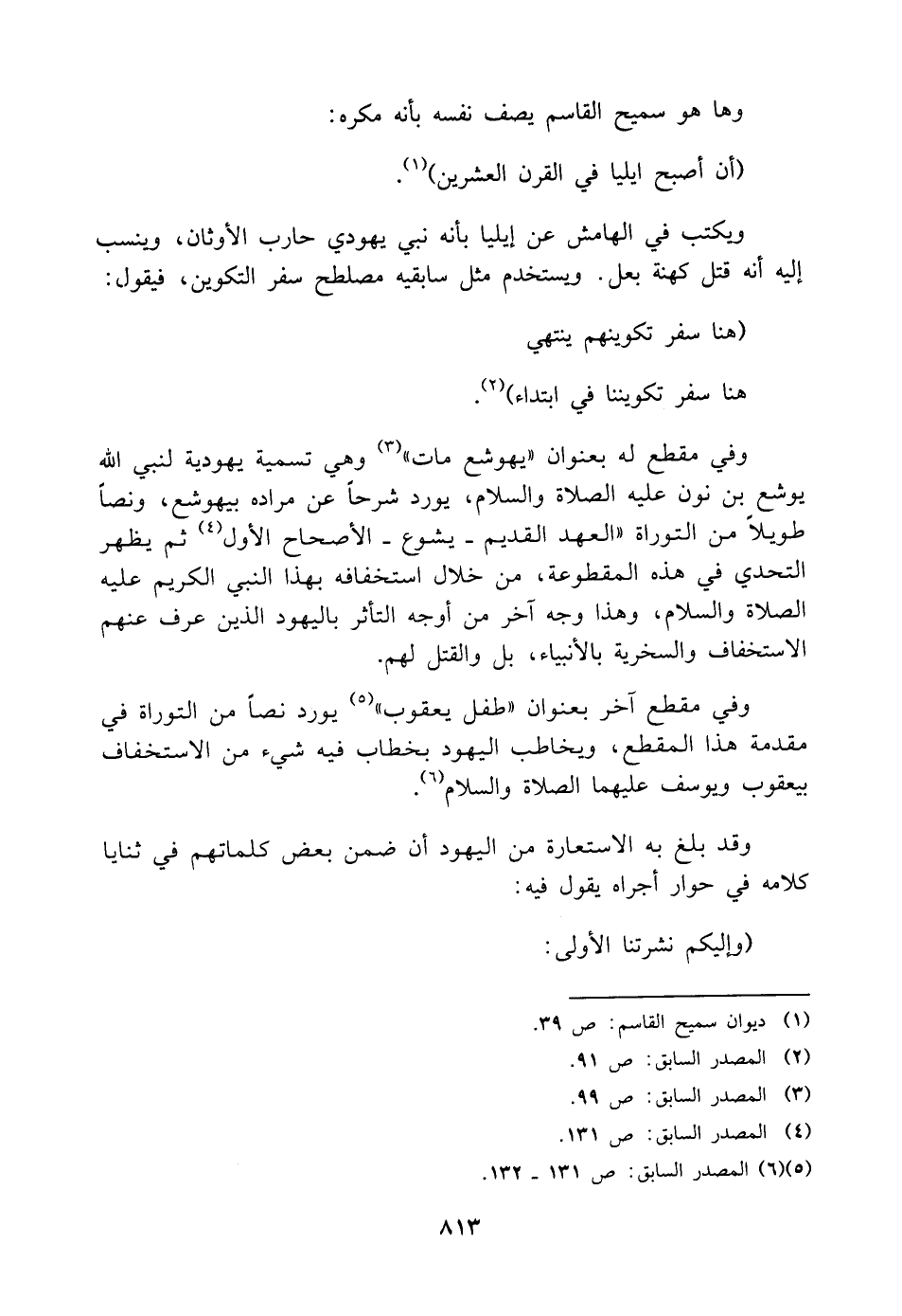 وفي مقطع له بعنوان "يهوشع مات" (¬٣) وهي تسمية يهودية لنبي اللَّه يوشع بن نون عليه الصلاة والسلام، يورد شرحًا عن مراده بيهوشع، ونصًا طويلًا من التوراة "العهد القديم -يشوع- الأصحاح الأول (¬٤) ثم يظهر التحدي في هذه المقطوعة، من خلال استخفافه بهذا النبي الكريم عليه الصلاة والسلام، وهذا وجه آخر من أوجه التأثر باليهود الذين عرف عنهم الاستخفاف والسخرية بالأنبياء، بل والقتل لهم.