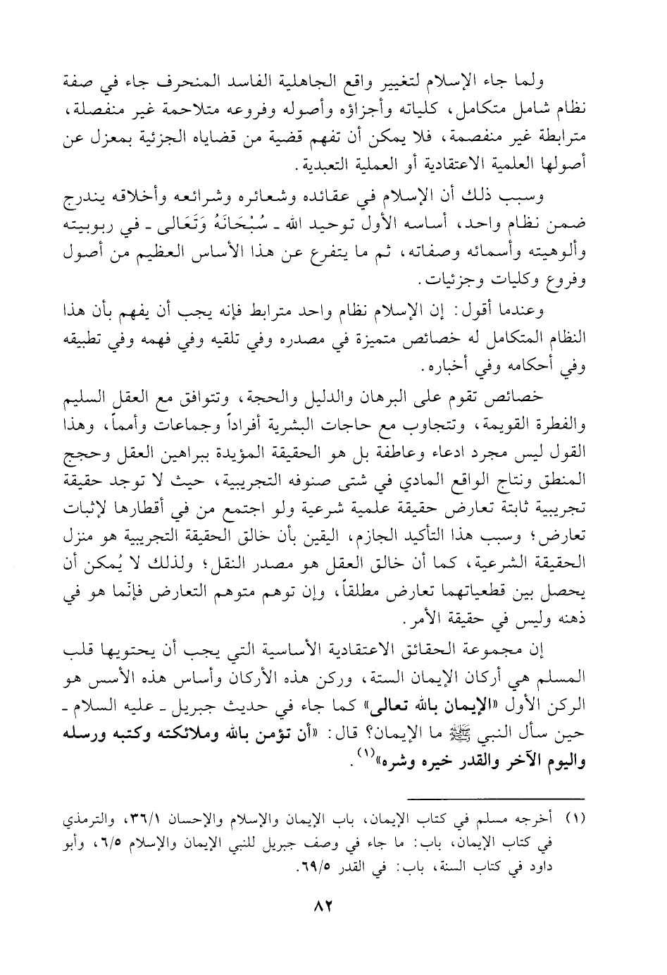 (¬١) أخرجه مسلم في كتاب الإيمان، باب الإيمان والإسلام والإحسان ١/ ٣٦، والترمذي في كتاب الإيمان، باب: ما جاء في وصف جبريل للنبي الإيمان والإسلام ٥/ ٦، وأبو داود في كتاب السنة، باب: في القدر ٥/ ٦٩.