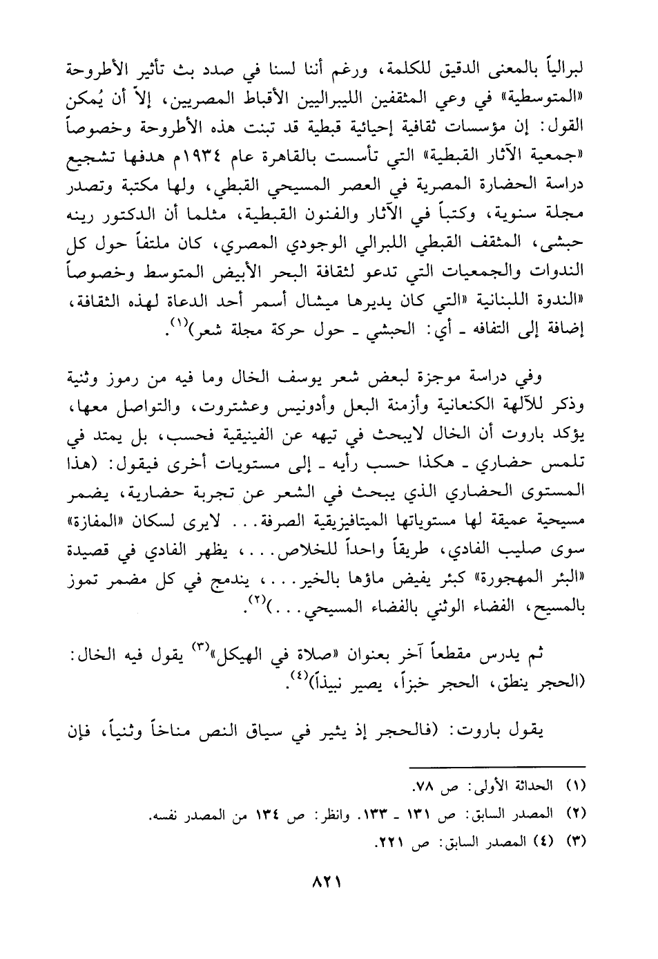 وفي دراسة موجزة لبعض شعر يوسف الخال وما فيه من رموز وثنية وذكر للآلهة الكنعانية وأزمنة البعل وأدونيس وعشتروت، والتواصل معها، يؤكد باروت أن الخال لا يبحث في تيهه عن الفينيقية فحسب، بل يمتد في تلمس حضاري -هكذا حسب رأيه- إلى مستويات أخرى فيقول: (هذا المستوى الحضاري الذي يبحث في الشعر عن تجربة حضارية، يضمر مسيحية عميقة لها مستوياتها الميتافيزيقية الصرفة. . . لا يرى لسكان "المفازة" سوى صليب الفادي، طريقًا واحدًا للخلاص. . .، يظهر الفادي في قصيدة "البئر المهجورة" كبئر يفيض ماؤها بالخير. . .، يندمج في كل مضمر تموز بالمسيح، الفضاء الوثني بالفضاء المسيحي. . .) (¬٢).