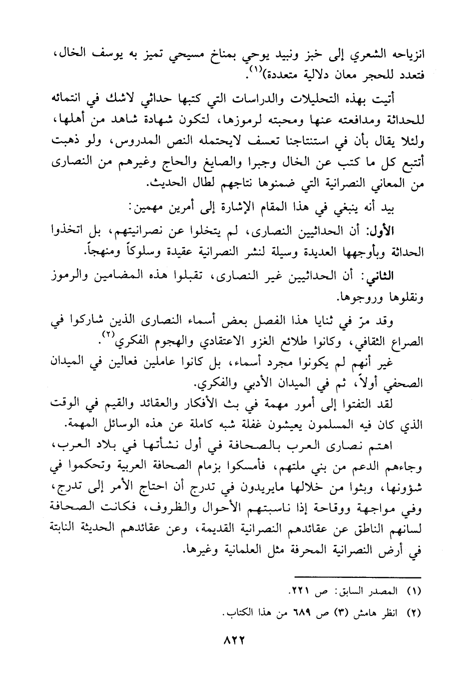 أتيت بهذه التحليلات والدراسات التي كتبها حداثي لا شك في انتمائه للحداثة ومدافعته عنها ومحبته لرموزها، لتكون شهادة شاهد من أهلها، ولئلا يقال بأن في استنتاجنا تعسف لا يحتمله النص المدروس، ولو ذهبت أتتبع كل ما كتب عن الخال وجبرا والصايغ والحاج وغيرهم من النصارى من المعاني النصرانية التي ضمنوها نتاجهم لطال الحديث.