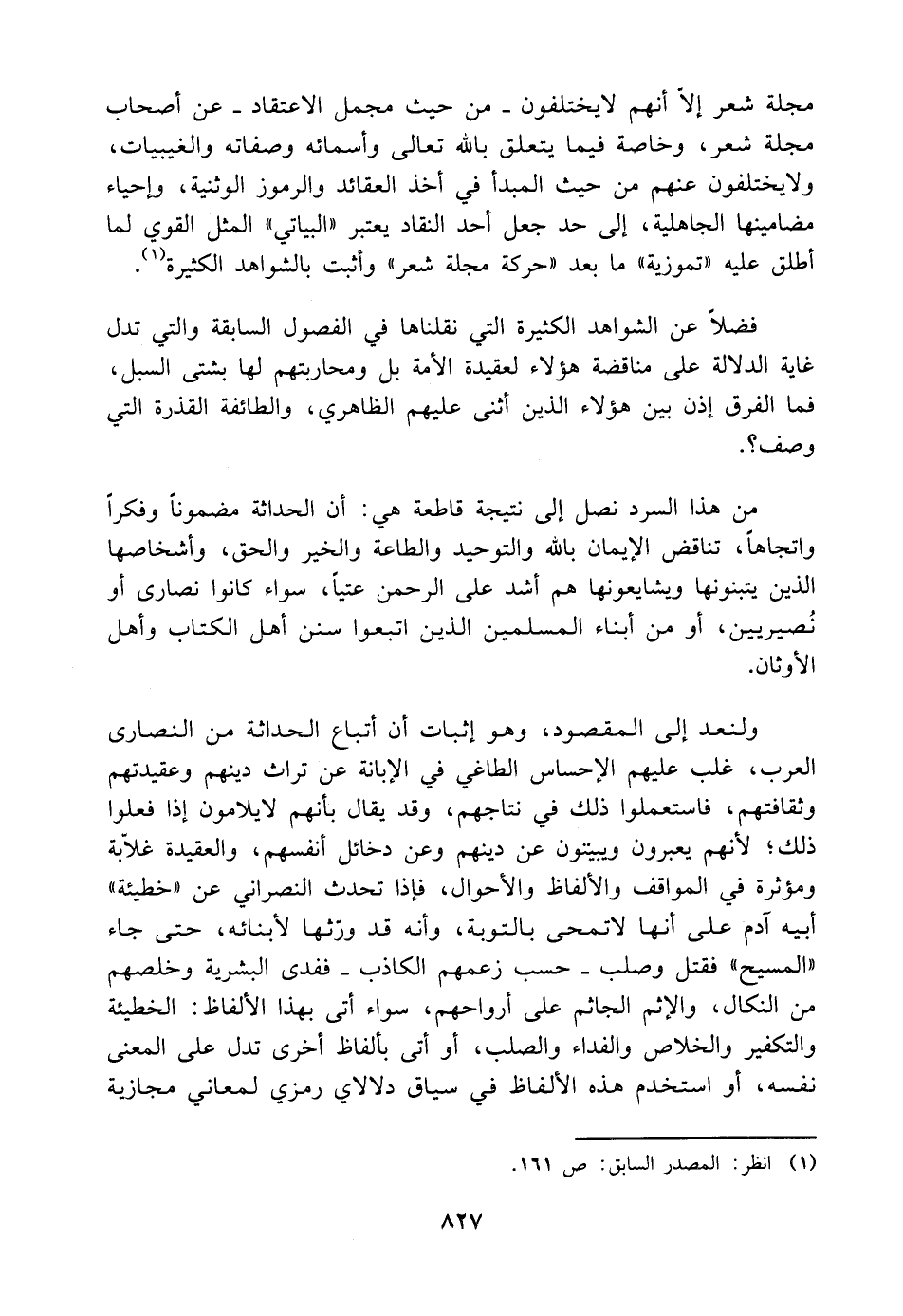 ولنعد إلى المقصود، وهو إثبات أن أتباع الحداثة من النصارى العرب، غلب عليهم الإحساس الطاغي في الإبانة عن تراث دينهم وعقيدتهم وثقافتهم، فاستعملوا ذلك في نتاجهم، وقد يقال بأنهم لا يلامون إذا فعلوا ذلك؛ لأنهم يعبرون ويبيتون عن دينهم وعن دخائل أنفسهم، والعقيدة غلابة ومؤثرة في المواقف والألفاظ والأحوال، فإذا تحدث النصراني عن "خطيئة" أبيه آدم على أنها لا تمحى بالتوبة، وأنه قد ورّثها لأبنائه، حتى جاء "المسيح" فقتل وصلب -حسب زعمهم الكاذب- ففدى البشرية وخلصهم من النكال، والإثم الجاثم على أرواحهم، سواء أتى بهذا الألفاظ: الخطيئة والتكفير والخلاص والفداء والصلب، أو أتى بألفاظ أخرى تدل على المعنى نفسه، أو استخدم هذه الألفاظ في سياق دلالاي رمزي لمعاني مجازية