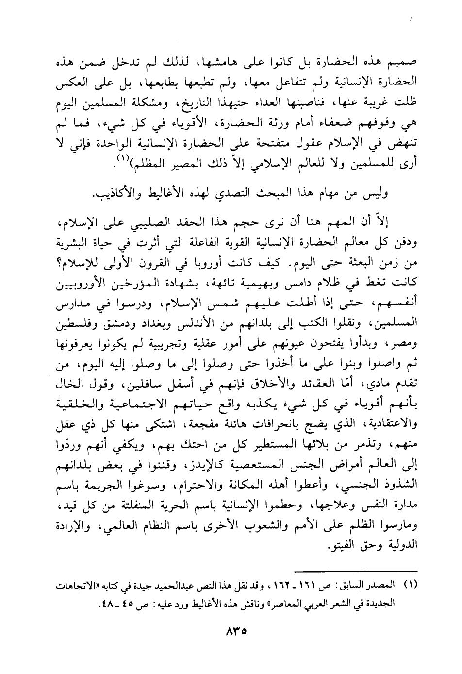 إلّا أن المهم هنا أن نرى حجم هذا الحقد الصليبي على الإسلام، ودفن كل معالم الحضارة الإنسانية القوية الفاعلة التي أثرت في حياة البشرية من زمن البعثة حتى اليوم. كيف كانت أوروبا في القرون الأولى للإسلام؟ كانت تغلط في ظلام دامس وبهيمية تائهة، بشهادة المؤرخين الأوروبيين أنفسهم، حتى إذا أطلت عليهم شمس الإسلام، ودرسوا في مدارس المسلمين، ونقلوا الكتب إلى بلدانهم من الأندلس وبغداد ودمشق وفلسطين ومصر، وبدأوا يفتحون عيونهم على أمور عقلية وتجريبية لم يكونوا يعرفونها ثم واصلوا وبنوا على ما أخذوا حتى وصلوا إلى ما وصلوا إليه اليوم، من تقدم مادي، أما العقائد والأخلاق فإنهم في أسفل سافلين، وقول الخال بأنهم أقوياء في كل شيء يكذبه واقع حياتهم الاجتماعية والخلقية والاعتقادية، الذي يضج بانحرافات هائلة مفجعة، اشتكى منها كل ذي عقل منهم، وتذمر من بلائها المستطير كل من احتك بهم، ويكفي أنهم وردّوا إلى العالم أمراض الجنس المستعصية كالإيدز، وقننوا في بعض بلدانهم الشذوذ الجنسي، وأعطوا أهله المكانة والاحترام، وسوغوا الجريمة باسم مدارة النفس وعلاجها، وحطموا الإنسانية باسم الحرية المنفلتة من كل قيد، ومارسوا الظلم على الأمم والشعوب الأخرى باسم النظام العالمي، والإرادة الدولية وحق الفيتو.