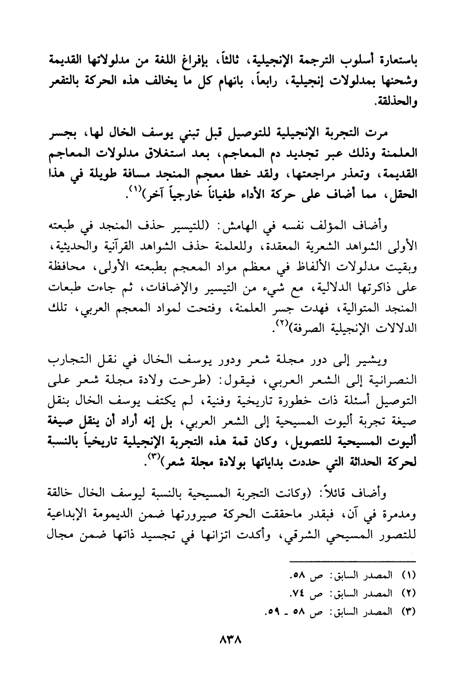 وأضاف المؤلف نفسه في الهامش: (للتيسير حذف المنجد في طبعته الأولى الشواهد الشعرية المعقدة، وللعلمنة حذف الشواهد القرآنية والحديثية، وبقيت مدلولات الألفاظ في معظم مواد المعجم بطبعته الأولى، محافظة على ذاكرتها الدلالية، مع شيء من التيسير والإضافات، ثم جاءت طبعات المنجد المتوالية، فهدت جسر العلمنة، وفتحت لمواد المعجم العربي، تلك الدلالات الإنجيلية الصرفة) (¬٢).