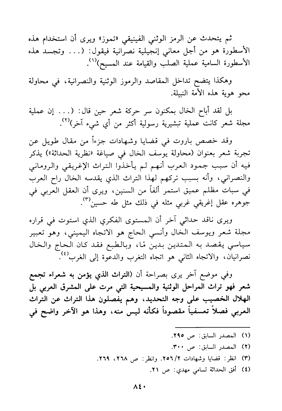 وفي موضع آخر يرى بصراحة أن (التراث الذي يؤمن به شعراء تجمع شعر فهو تراث المراحل الوثنية والمسيحية التي مرت على المشرق العربي بل الهلال الخصيب على وجه التحديد، وهم يفصلون هذا التراث عن التراث العربي فصلًا تعسفيًا مقصودًا فكأنه ليس منه، وهذا هو الآخر واضح في