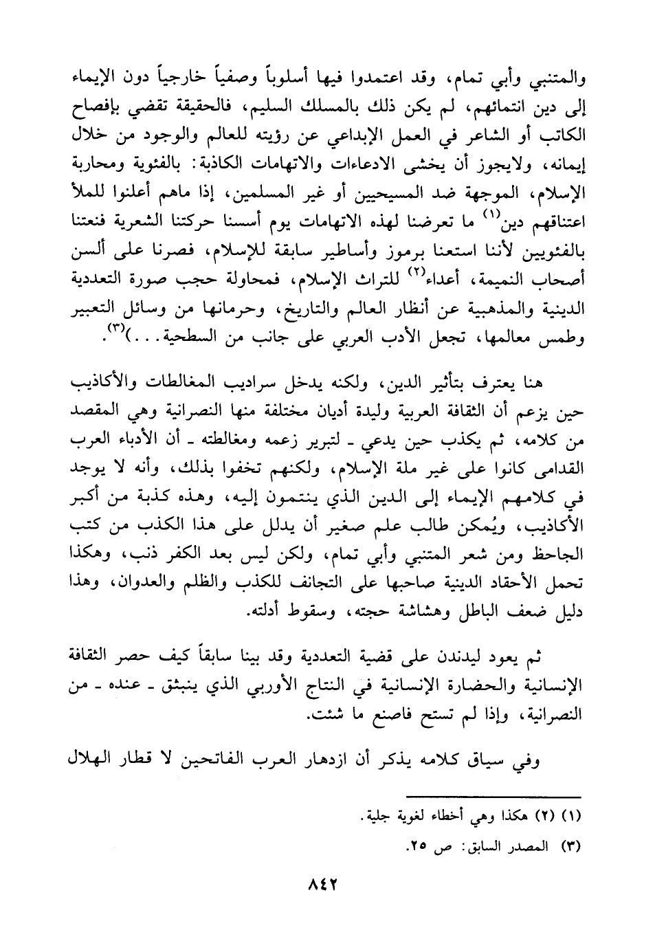 هنا يعترف بتأثير الدين، ولكنه يدخل سراديب المغالطات والأكاذيب حين يزعم أن الثقافة العربية وليدة أديان مختلفة منها النصرانية وهي المقصد من كلامه، ثم يكذب حين يدعي -لتبرير زعمه ومغالطته- أن الأدباء العرب القدامى كانوا على غير ملة الإسلام، ولكنهم تخفوا بذلك، وأنه لا يوجد في كلامهم الإيماء إلى الدين الذي ينتمون إليه، وهذه كذبة من أكبر الأكاذيب، ويُمكن طالب علم صغير أن يدلل على هذا الكذب من كتب الجاحظ ومن شعر المتنبي وأبي تمام، ولكن ليس بعد الكفر ذنب، وهكذا تحمل الأحقاد الدينية صاحبها على التجانف للكذب والظلم والعدوان، وهذا دليل ضعف الباطل وهشاشة حجته، وسقوط أدلته.