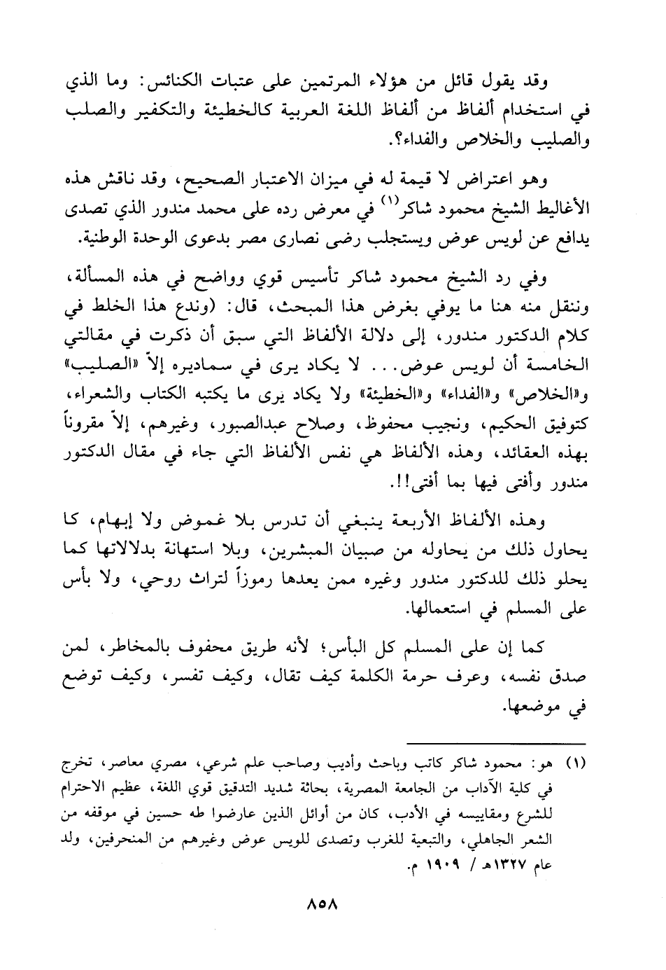 وفي رد الشيخ محمود شاكر تأسيس قوي وواضح في هذه المسألة، وننقل منه هنا ما يوفي بغرض هذا المبحث، قال: (وندع هذا الخلط في كلام الدكتور مندور، إلى دلالة الألفاظ التي سبق أن ذكرت في مقالتي الخامسة أن لويس عوض. . . لا يكاد يرى في سماديره إلّا "الصليب" و"الخلاص" و"الفداء" و"الخطيئة" ولا يكاد يرى ما يكتبه الكتاب والشعراء، كتوفيق الحكيم، ونجيب محفوظ، وصلاح عبد الصبور، وغيرهم، إلّا مقرونًا بهذه العقائد، وهذه الألفاظ هي نفس الألفاظ التي جاء في مقال الدكتور مندور وأفتى فيها بما أفتى! ! .