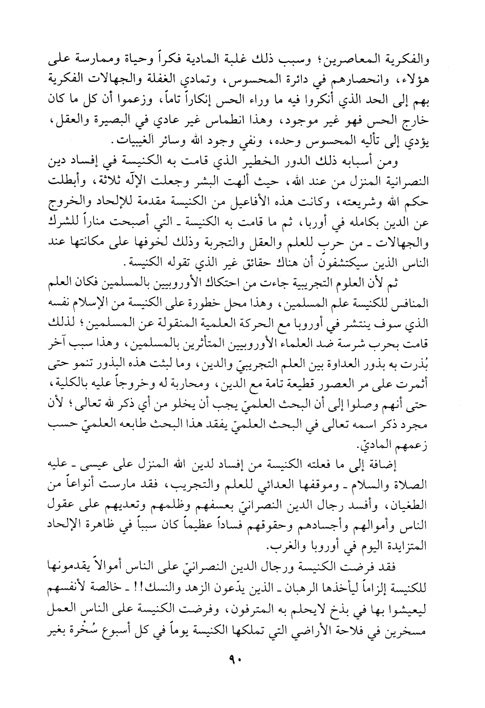 ثم لأن العلوم التجريبية جاءت من احتكاك الأوروبيين بالمسلمين فكان العلم المنافس للكنيسة علم المسلمين، وهذا محل خطورة على الكنيسة من الإسلام نفسه الذي سوف ينتشر في أوروبا مع الحركة العلمية المنقولة عن المسلمين؛ لذلك قامت بحرب شرسة ضد العلماء الأوروبيين المتأثرين بالمسلمين، وهذا سبب آخر بُذرت به بذور العداوة بين العلم التجريبيّ والدين، وما لبثت هذه البذور تنمو حتى أثمرت على مر العصور قطيعة تامة مع الدين، ومحاربة له وخروجًا عليه بالكلية، حتى أنهم وصلوا إلى أن البحث العلميّ يجب أن يخلو من أي ذكر للَّه تعالى؛ لأن مجرد ذكر اسمه تعالى في البحث العلميّ يفقد هذا البحث طابعه العلميّ حسب زعمهم الماديّ.