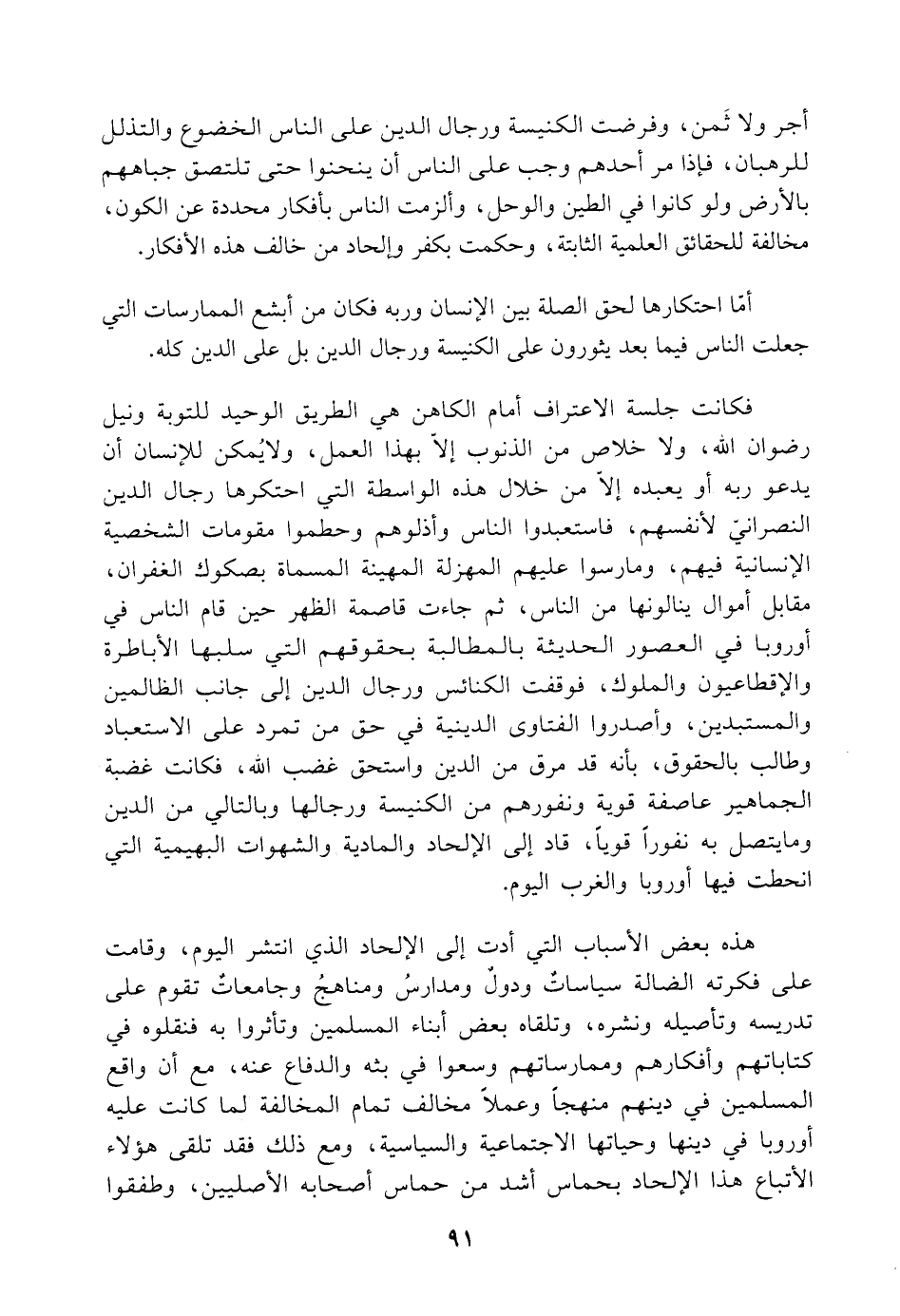 فكانت جلسة الاعتراف أمام الكاهن هي الطريق الوحيد للتوبة ونيل رضوان اللَّه، ولا خلاص من الذنوب إلّا بهذا العمل، ولا يُمكن للإنسان أن يدعو ربه أو يعبده إلّا من خلال هذه الواسطة التي احتكرها رجال الدين النصرانيّ لأنفسهم، فاستعبدوا الناس وأذلوهم وحطموا مقومات الشخصية الإنسانية فيهم، ومارسوا عليهم المهزلة المهينة المسماة بصكوك الغفران، مقابل أموال ينالونها من الناس، ثم جاءت قاصمة الظهر حين قام الناس في أوروبا في العصور الحديثة بالمطالبة بحقوقهم التي سلبها الأباطرة والإقطاعيون والملوك، فوقفت الكنائس ورجال الدين إلى جانب الظالمين والمستبدين، وأصدروا الفتاوى الدينية في حق من تمرد على الاستعباد وطالب بالحقوق، بأنه قد مرق من الدين واستحق غضب اللَّه، فكانت غضبة الجماهير عاصفة قوية ونفورهم من الكنيسة ورجالها وبالتالي من الدين وما يتصل به نفورًا قويًا، قاد إلى الإلحاد والمادية والشهوات البهيمية التي انحطت فيها أوروبا والغرب اليوم.