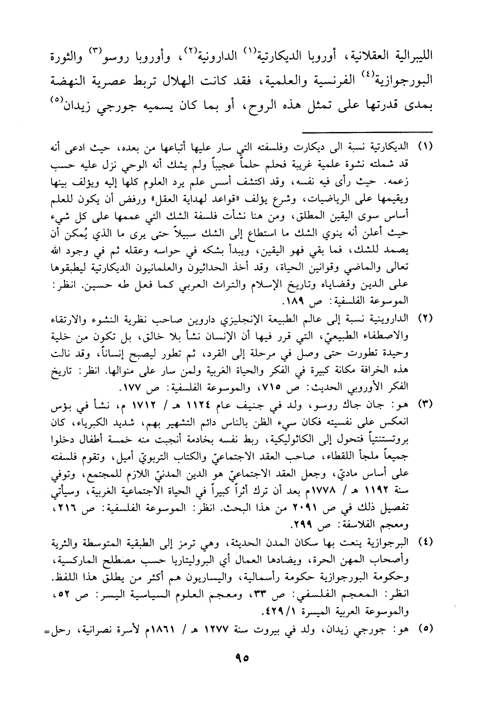 الليبرالية العقلانية، أوروبا الديكارتية (¬١) الدارونية (¬٢)، وأوروبا روسو (¬٣) والثورة البورجوازية (¬٤) الفرنسية والعلمية، فقد كانت الهلال تربط عصرية النهضة بمدى قدرتها على تمثل هذه الروح، أو بما كان يسميه جورجي زيدان (¬٥)