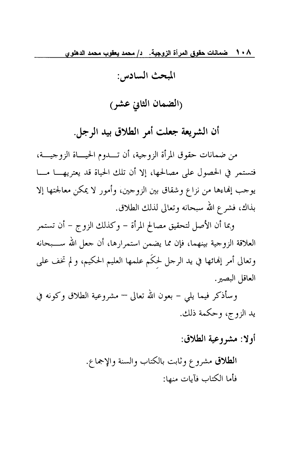 المبحث السادس: (الضمان الثاني عشر) : أن الشريعة جعلت أمر الطلاق بيد الرجل.