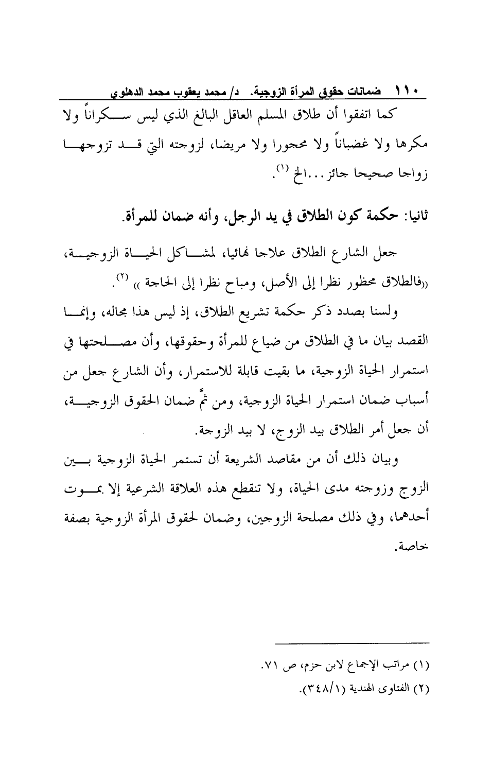 ولسنا بصدد ذكر حكمة تشريع الطلاق، إذ ليس هذا مجاله، وإنما القصد بيان ما في الطلاق من ضياع للمرأة وحقوقها، وأن مصلحتها في استمرار الحياة الزوجية، ما بقيت قابلة للاستمرار، وأن الشارع جعل من أسباب ضمان استمرار الحياة الزوجية، ومن ثمَّ ضمان الحقوق الزوجية، أن جعل أمر الطلاق بيد الزوج، لا بيد الزوجة.